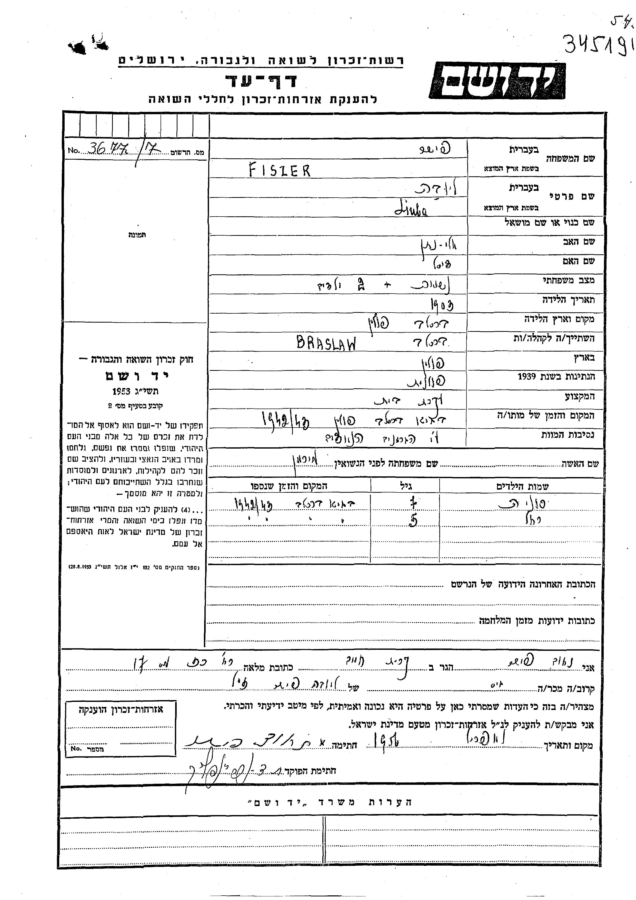 Fiszer Liuba 1903 Braslaw, Pologne Feuille de témoignage