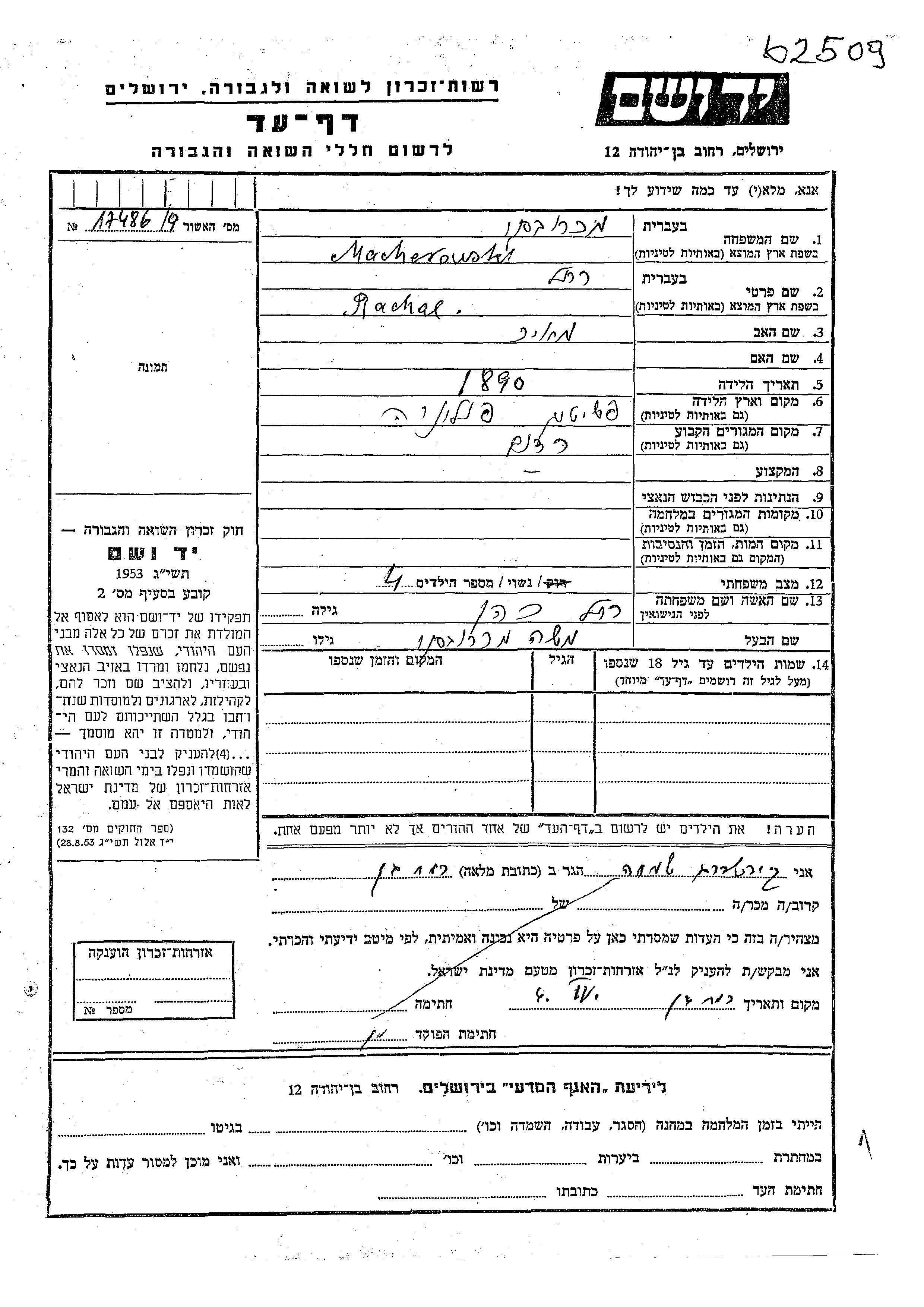 Rachal Macherowski née Kohen est née à Pologne en 1890, fille de Meir. Elle était Mariée à Moshe. Avant la seconde guerre mondiale elle vivait à Radom, Pologne.