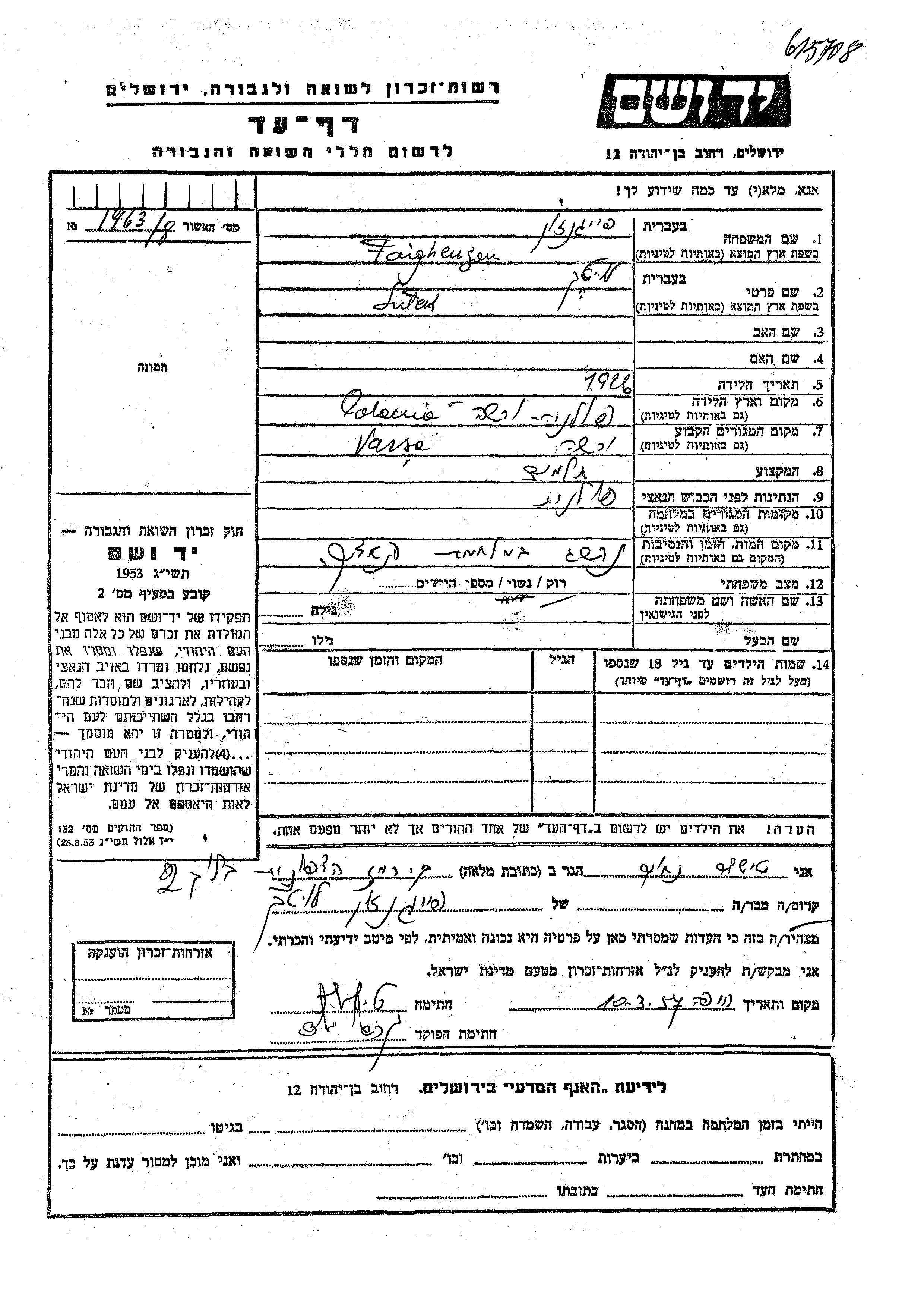 Faighenzon Lutek 1926 Warsaw, Pologne Feuille de témoignage