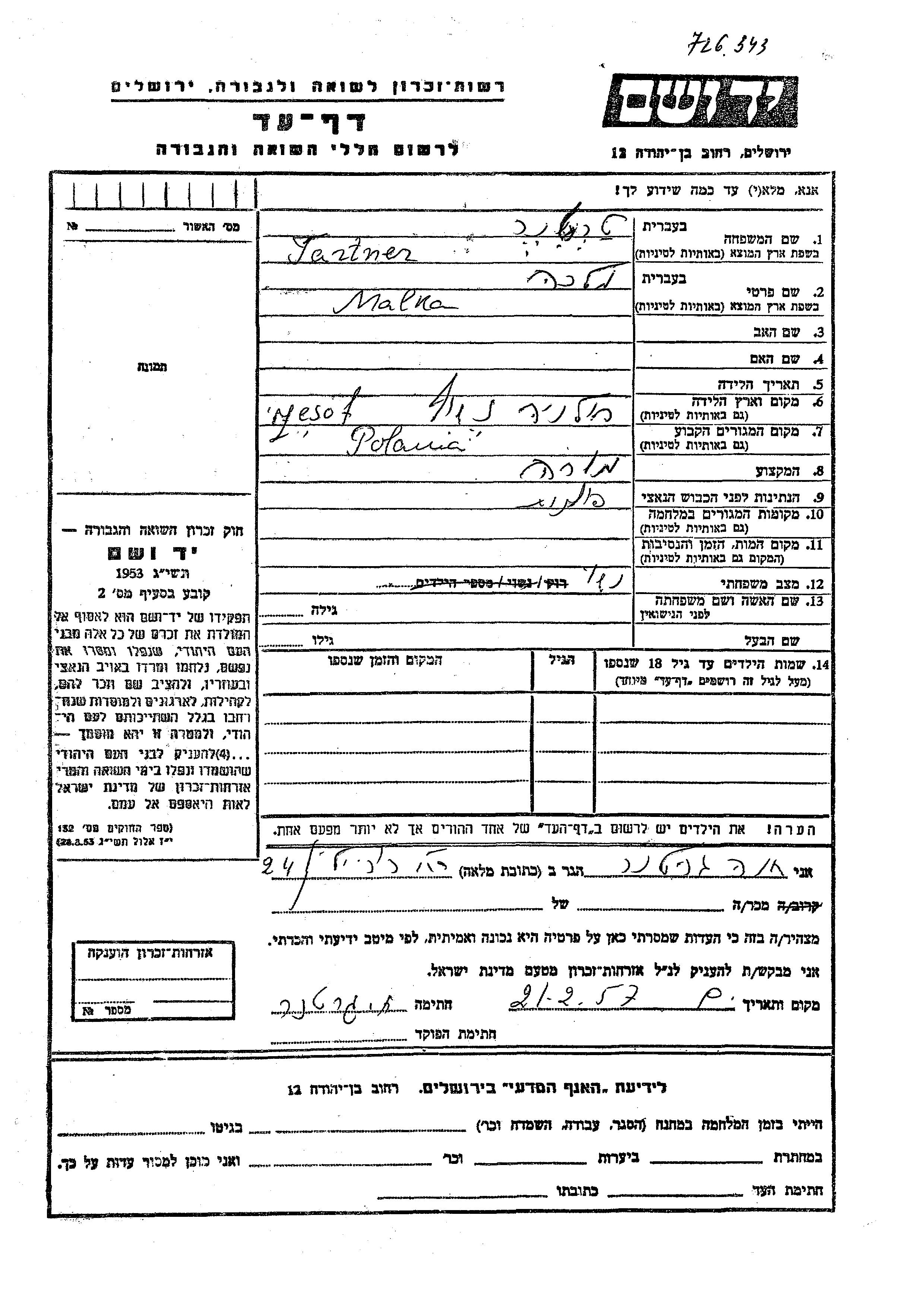 Tartner Malka Zeshov, Pologne Feuille de témoignage