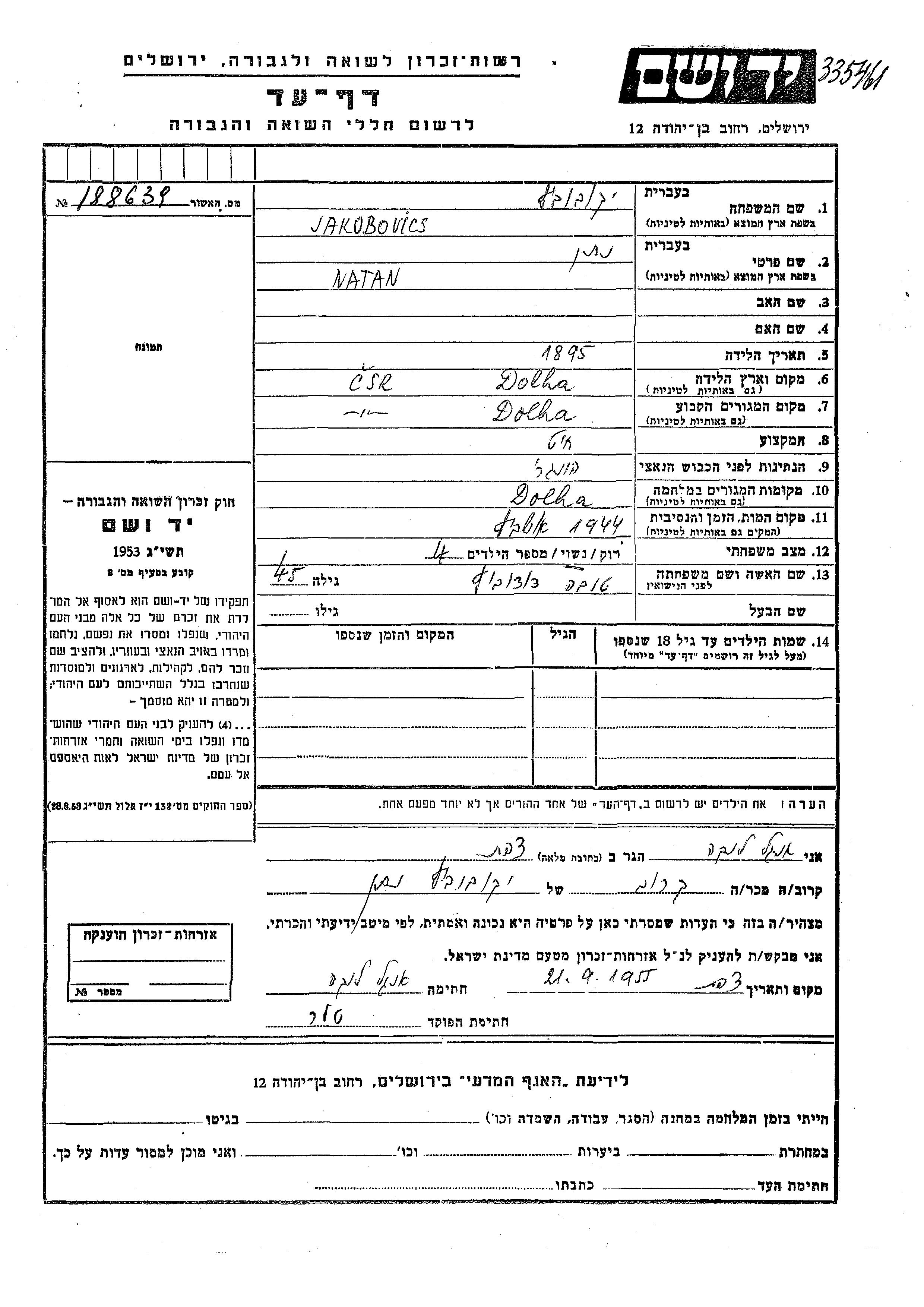 Jakobovicz Natan 1895 Dolha, Tchécoslovaquie Feuille de témoignage