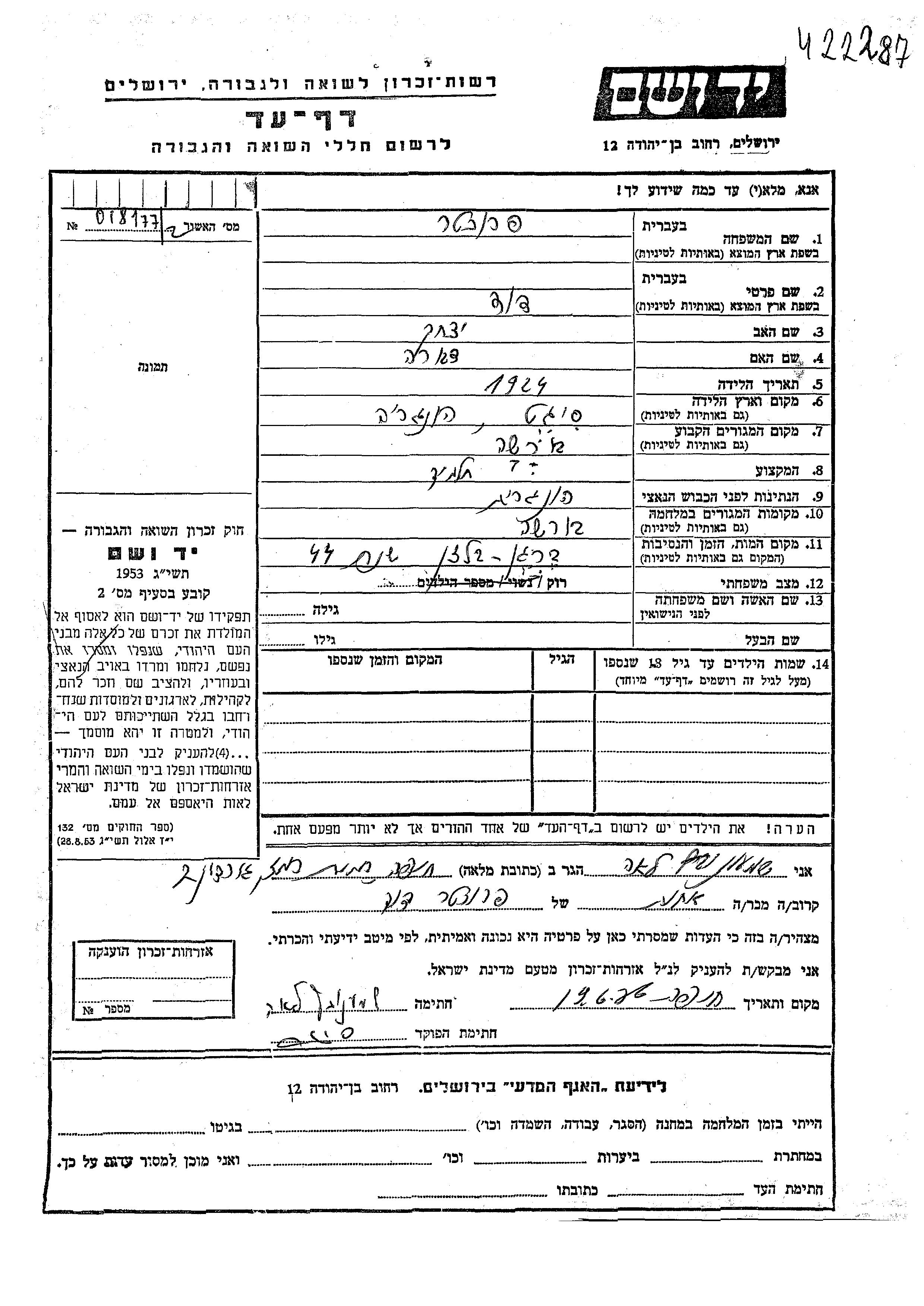 Frukhter David 1924 Borsa, Roumanie Feuille de témoignage