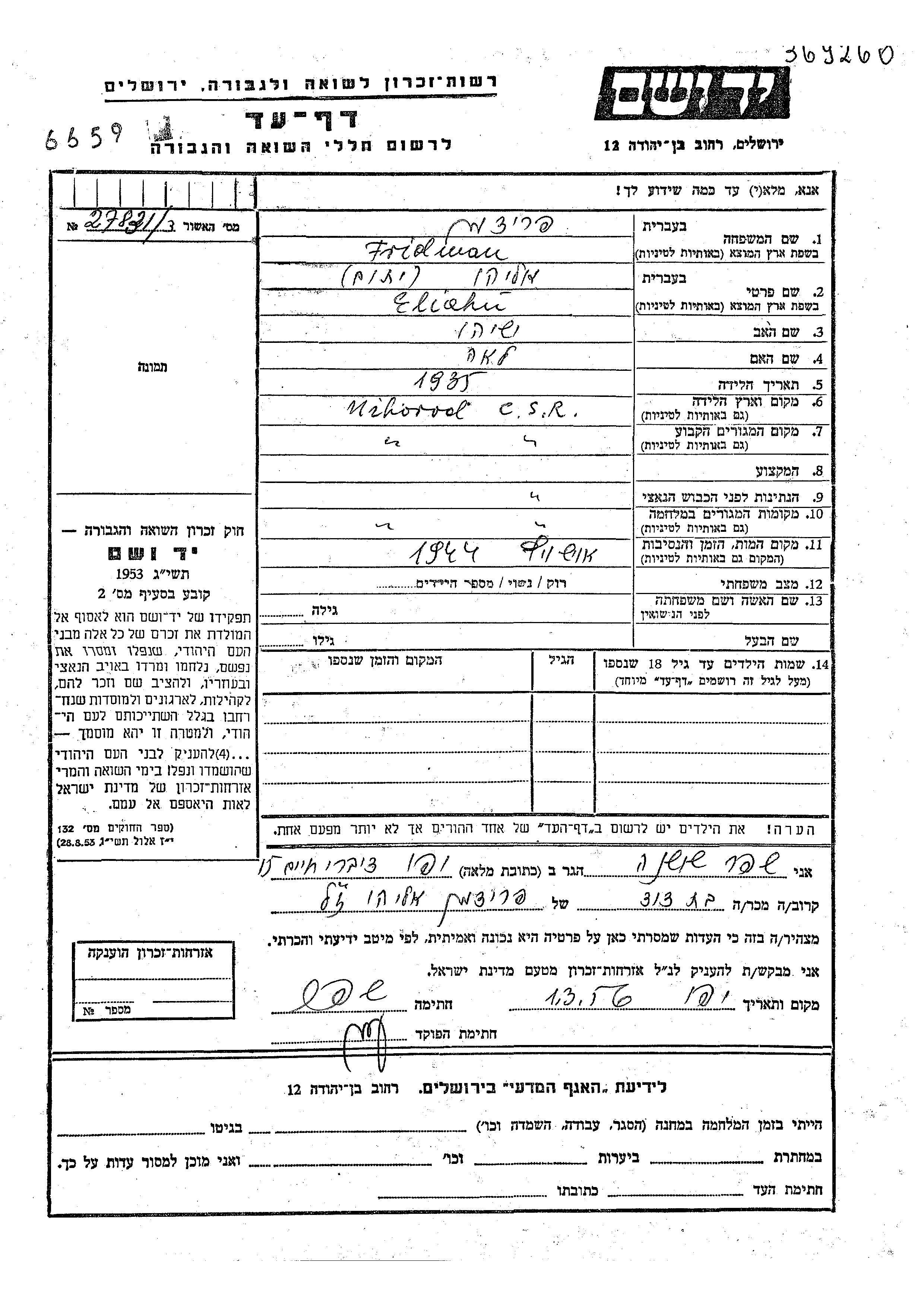 Fridman Eliahu Yatom 1935 Uzhorod, Tchécoslovaquie Feuille de témoignage