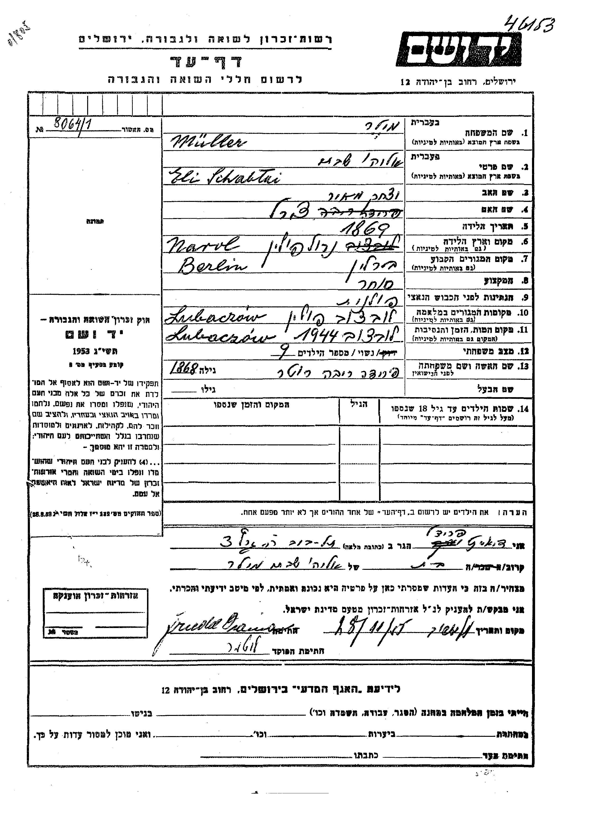 Eli Schabtai Eliahu Muller est né à Narol, Pologne en 1869, fils de Yitzkhak Meir et de Tzirel. Il était Commerçant/e et Mariée à Frida Riva née Roter. Avant la seconde guerre mondiale il vivait à Berlin, Allemagne. Au cours de la guerre, il était à Lubaczow, Pologne.