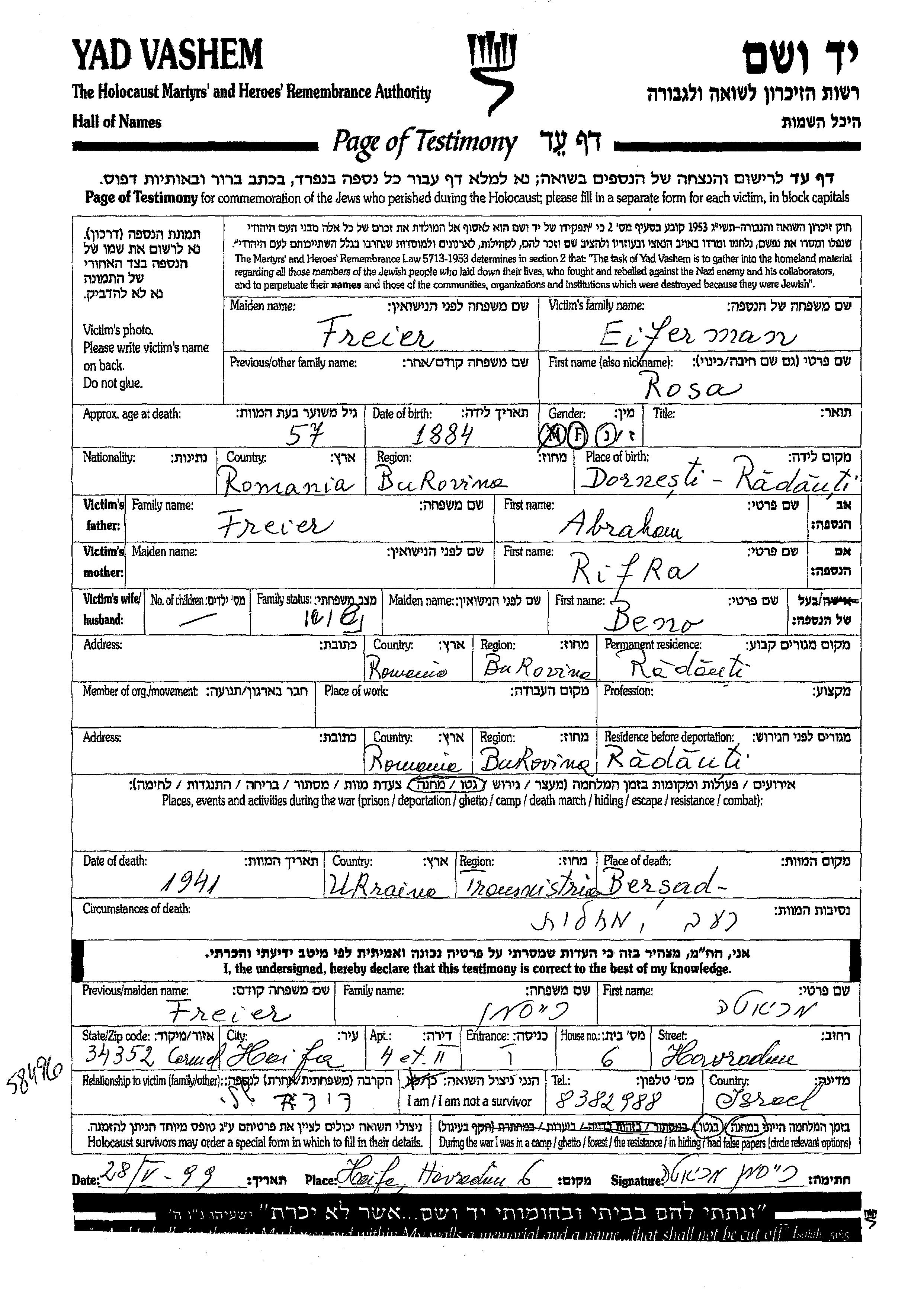 Rosa Eiferman née Freier est née à Dornesti, Roumanie en 1884, fille de Abraham et de Rivka. Elle était Mariée à Beno. Avant la seconde guerre mondiale elle vivait à Radauti, Roumanie. Pendant la guerre, elle était à Radauti, Roumanie.