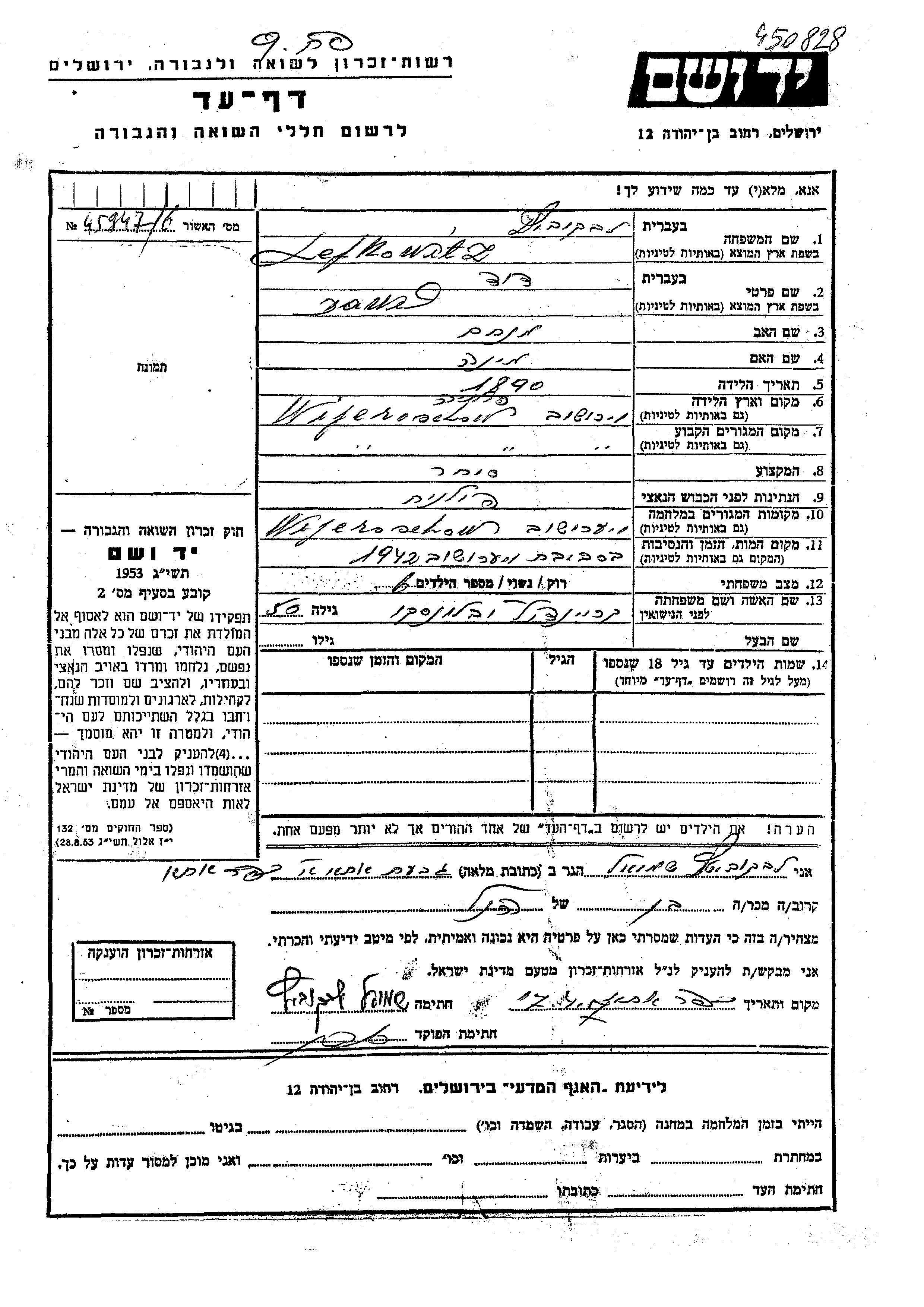 Lefkowitz David 1890 Wieroszow, Pologne Feuille de témoignage
