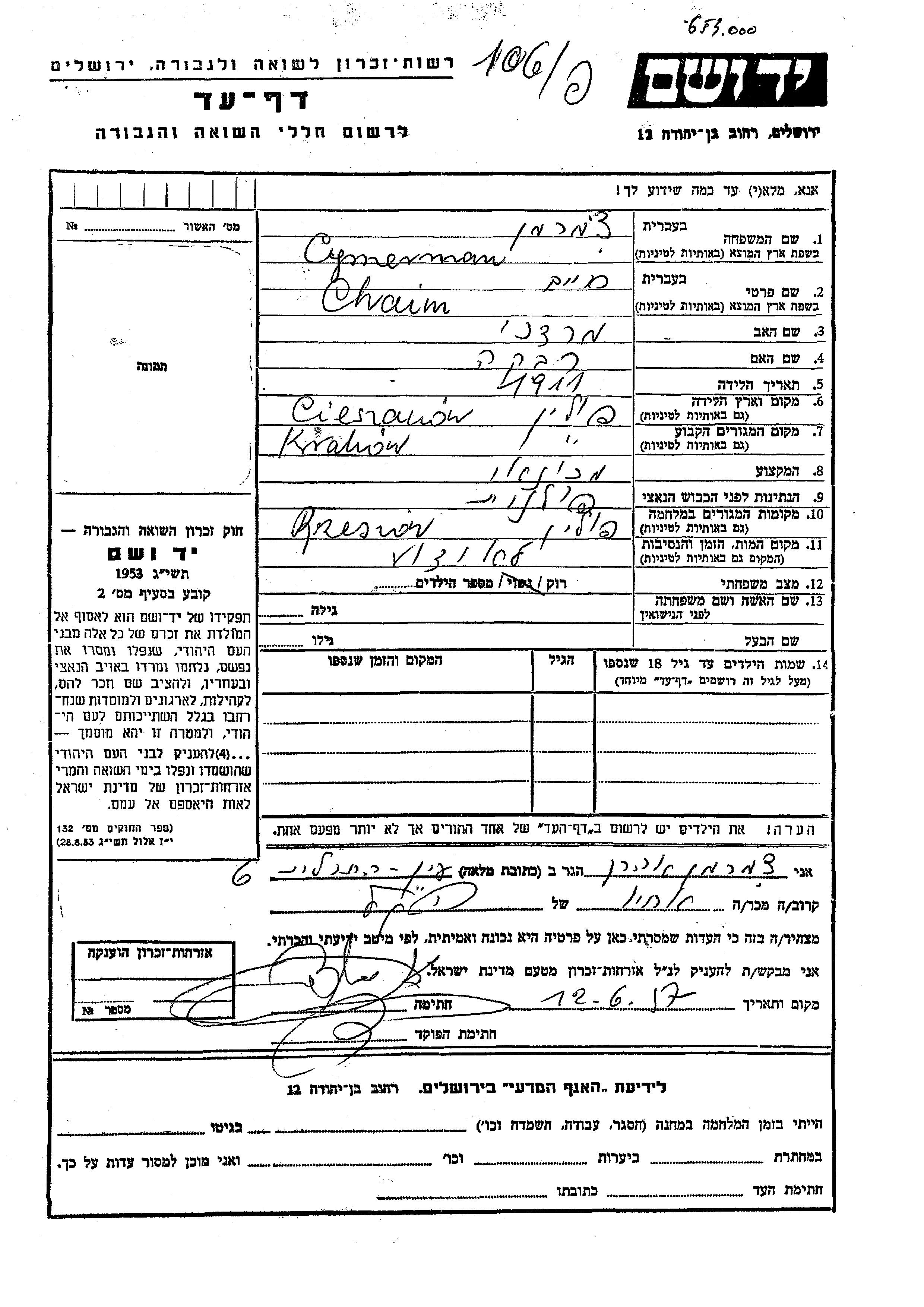 Cymerman Chaim 1911 Krakow, Pologne Feuille de témoignage
