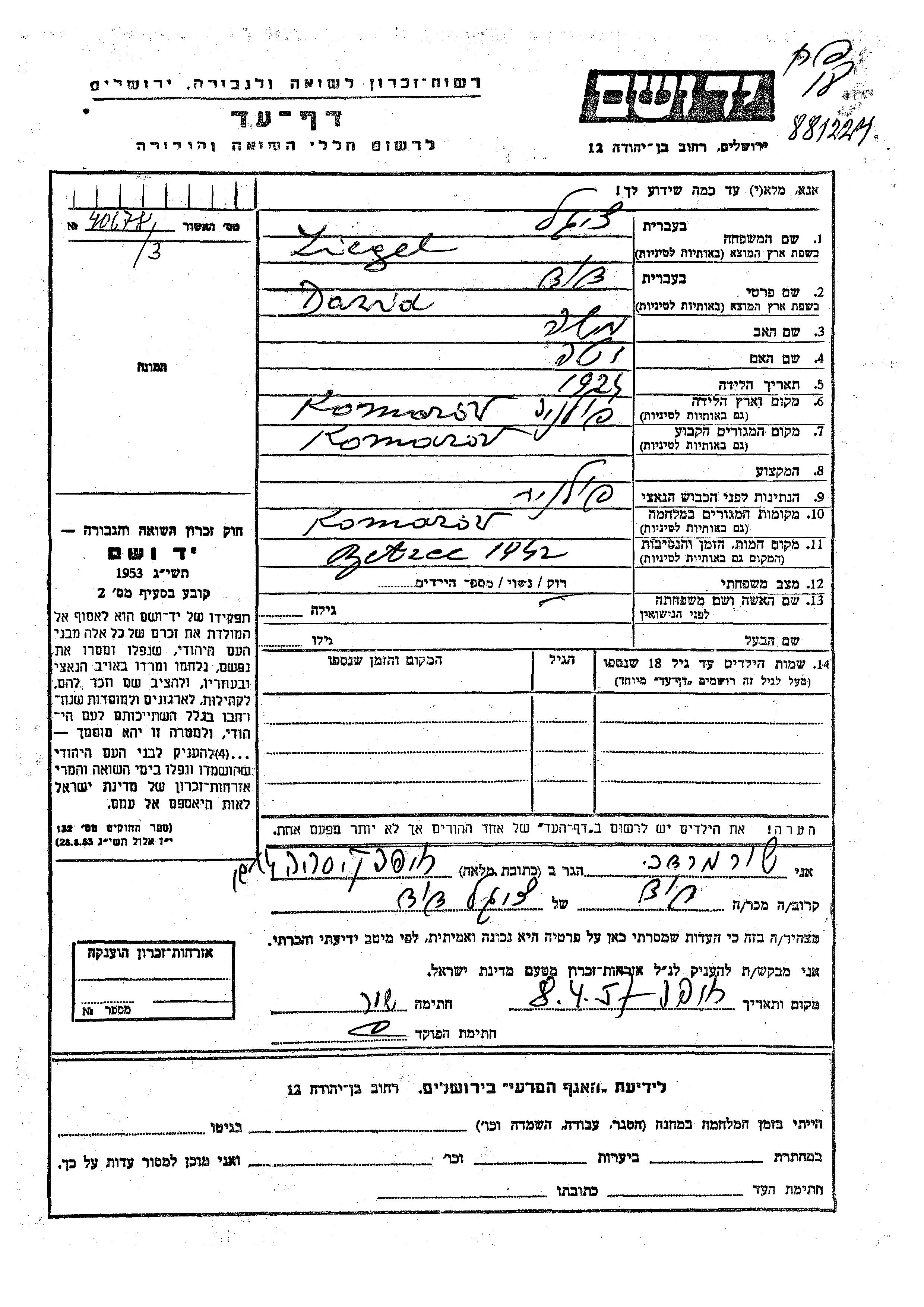 Dawid Ziegel est né à Komorow, Pologne en 1924, fils de Moshe et de Veta. Il était Célibataire. Avant la seconde guerre mondiale il vivait à Komorow, Pologne. Au cours de la guerre, il était à Komorow, Pologne.