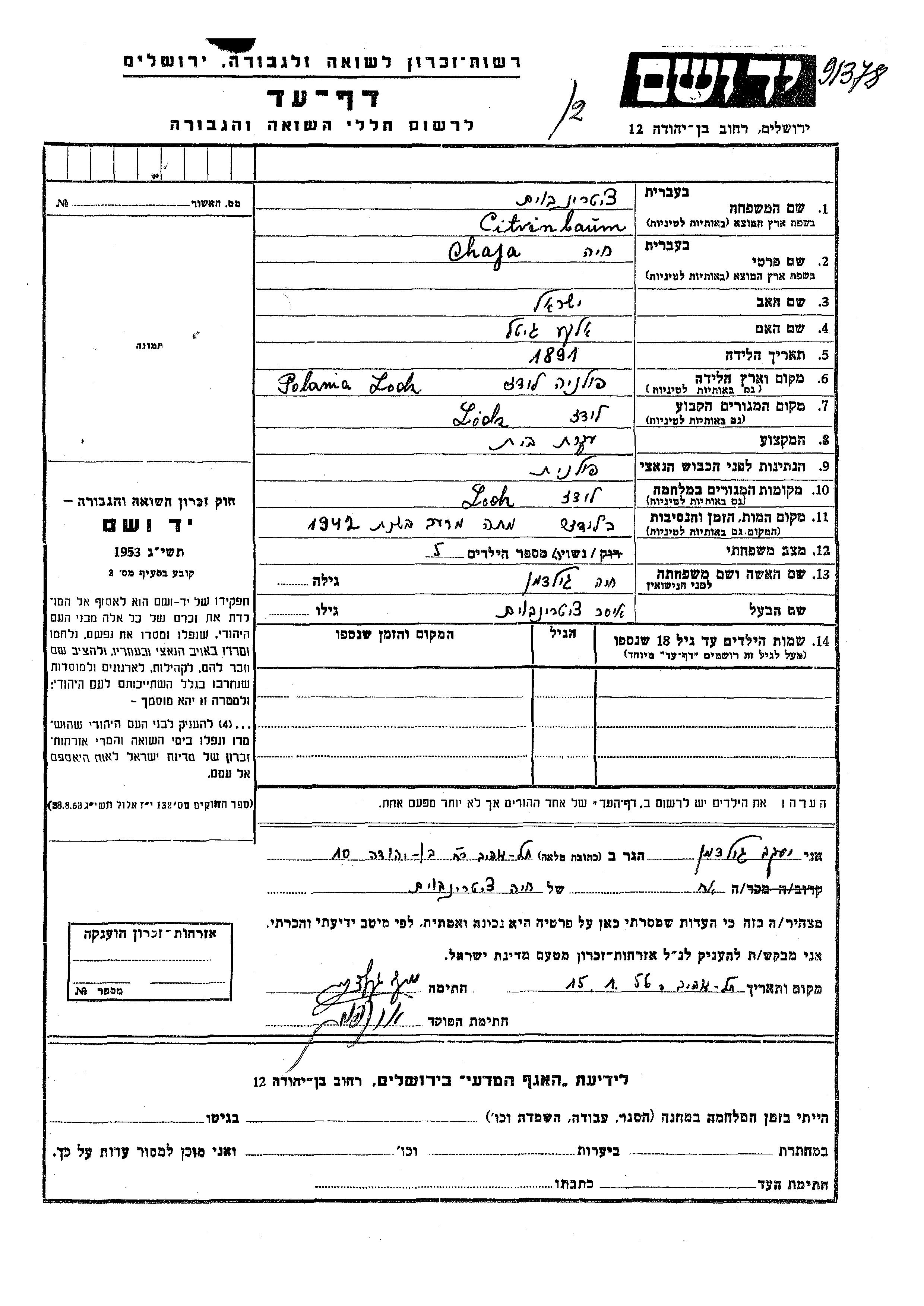 Citrinbaum Chaja 1891 Lodz, Pologne Feuille de témoignage