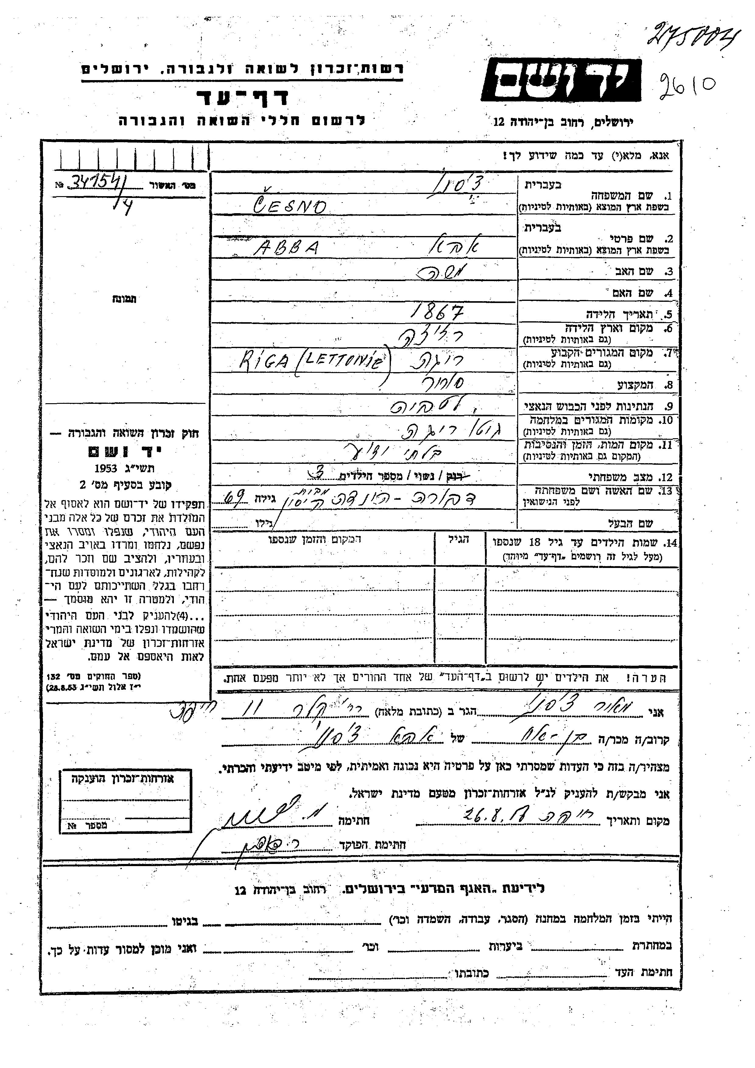 Aba Cesno est né à Rezica, Lettonie en 1867, fils de Moshe. Il était Commerçant/e et Mariée à Dvora Hinda née Khason. Avant la seconde guerre mondiale il vivait à Riga, Lettonie. Au cours de la guerre, il était à Riga, Lettonie.