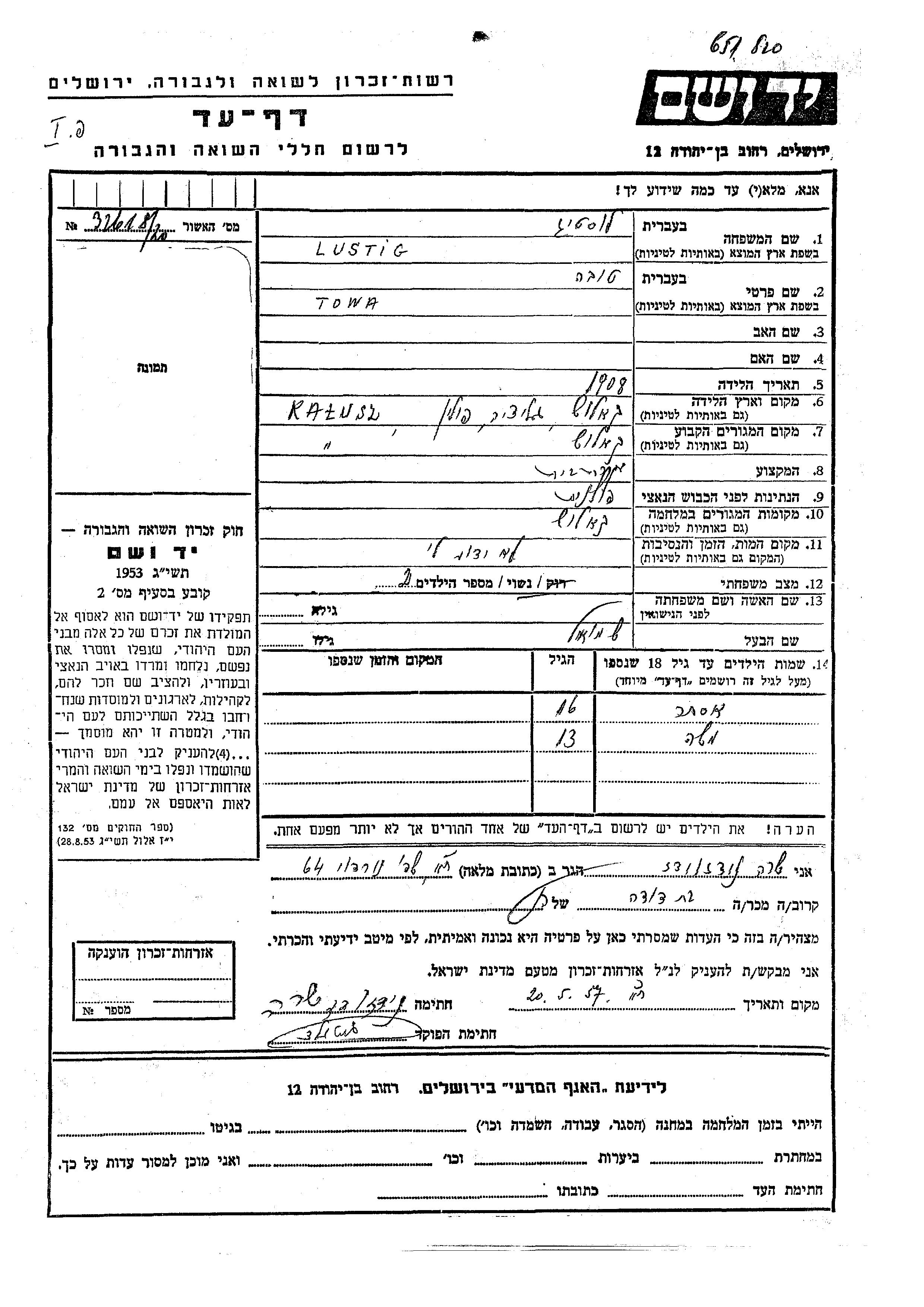 Towa Lustig est née à Kalusz, Pologne en 1908. Elle était Femme au foyer et Mariée à Shmuel. Avant la seconde guerre mondiale elle vivait à Kalusz, Pologne. Pendant la guerre, elle était à Kalusz, Pologne.