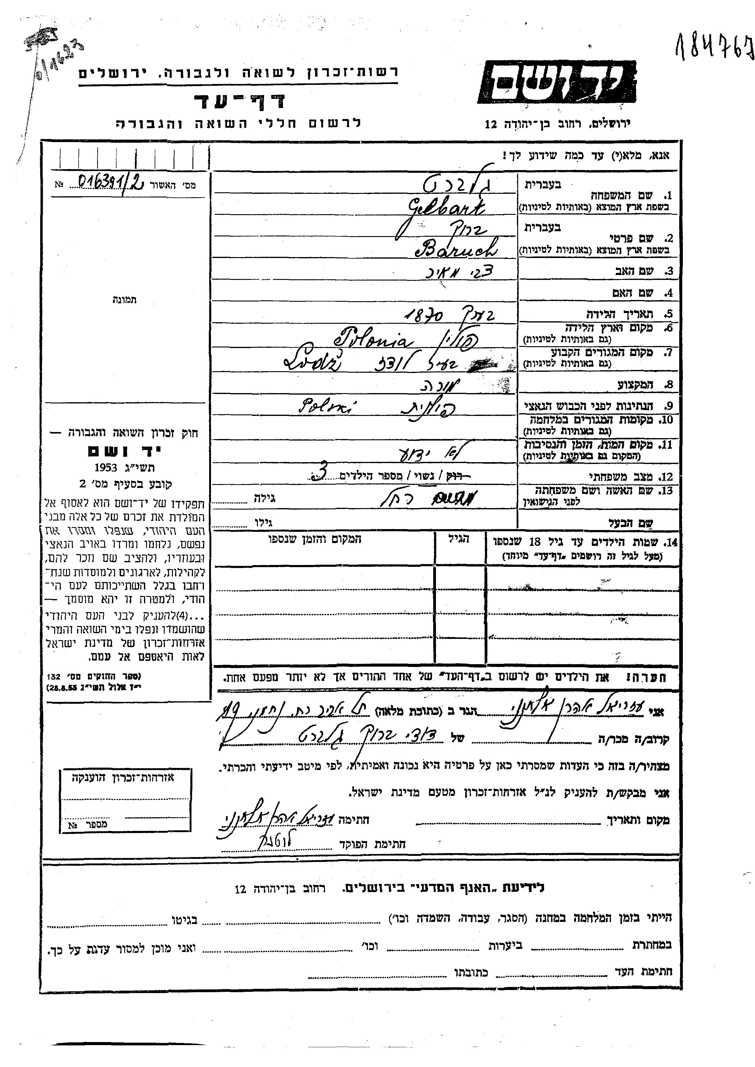 Gelbart Baruch 1870 Lodz, Pologne Feuille de témoignage