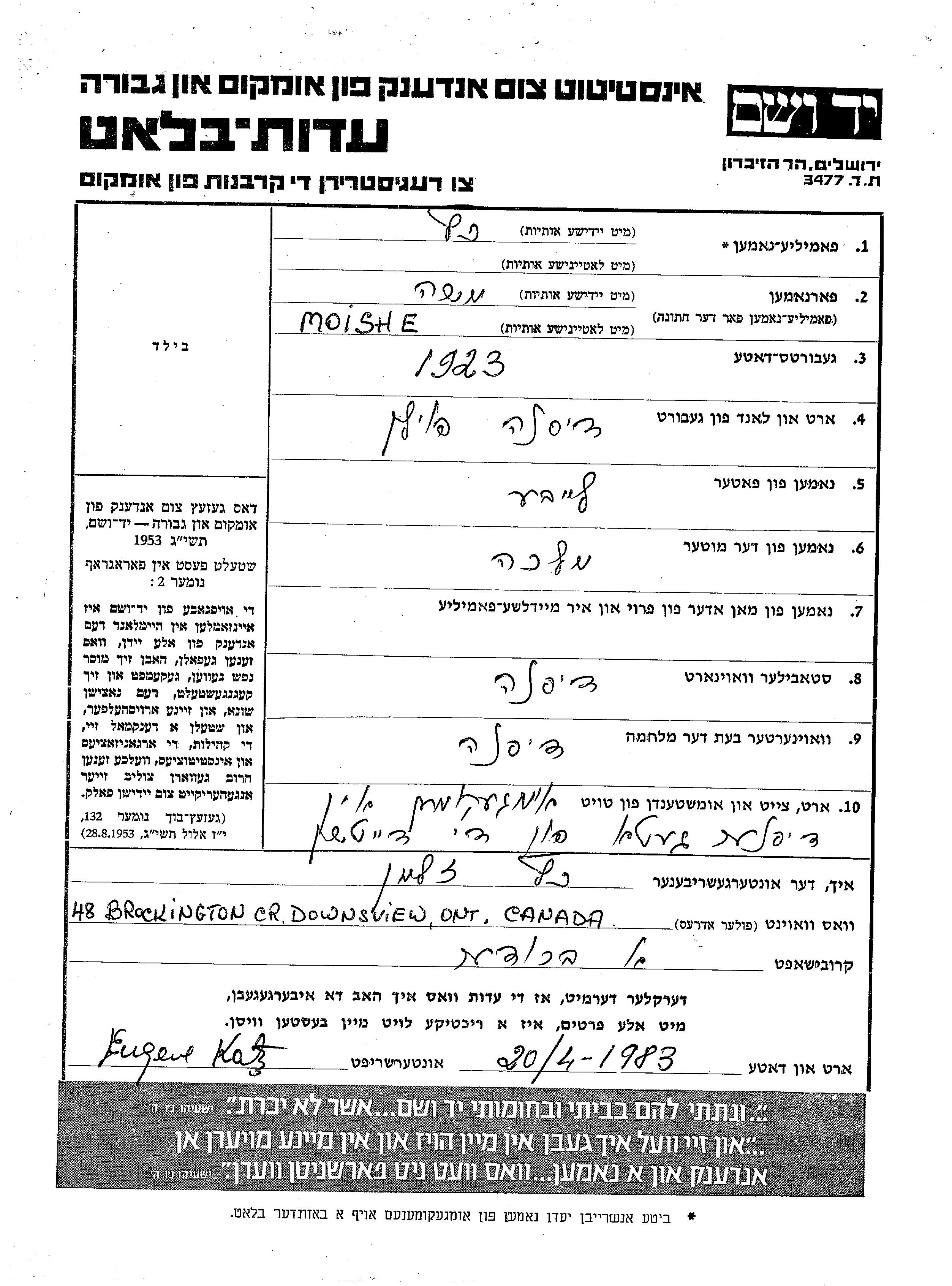 Katz Moishe 1923 Dzisna, Pologne Feuille de témoignage