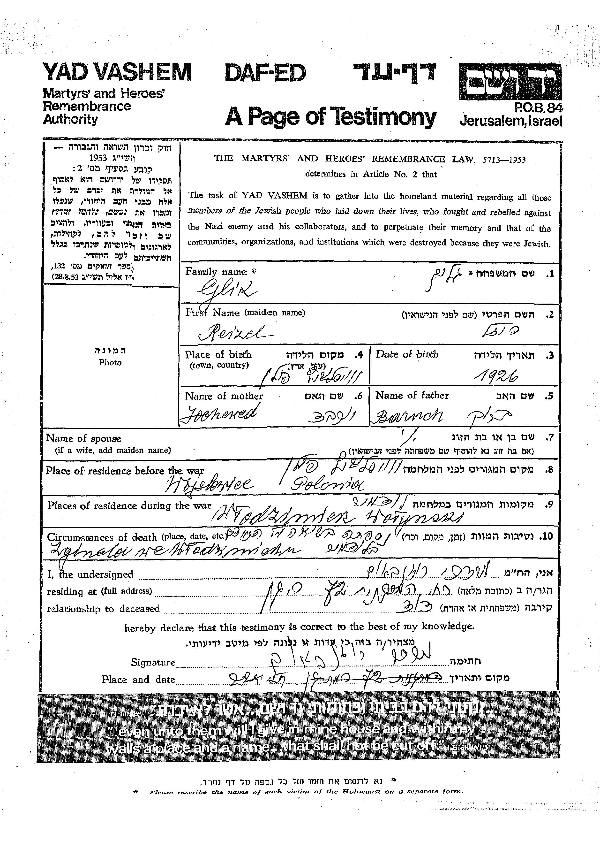 Glik Reizl 1926 Wojslawice, Pologne Feuille de témoignage