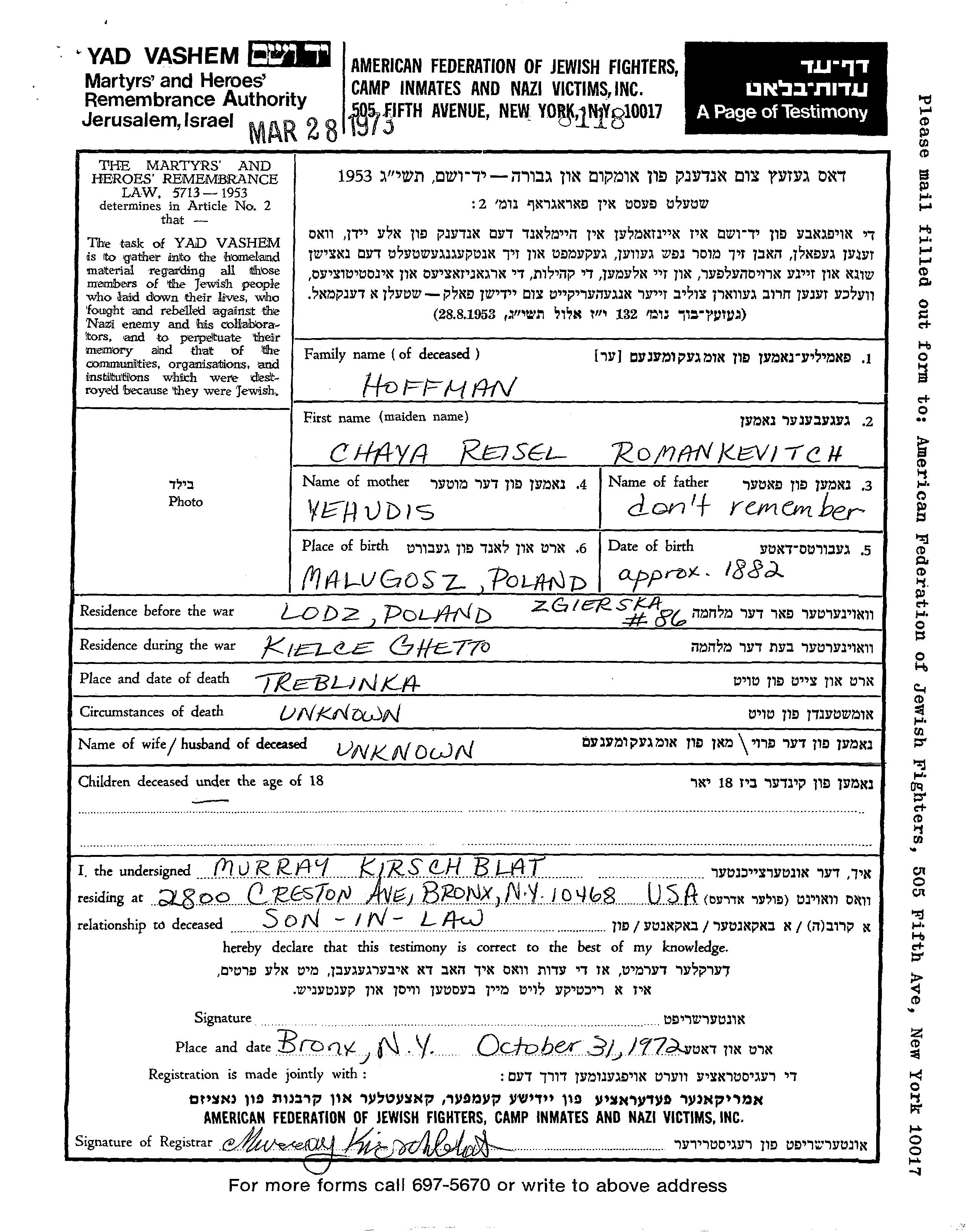 Chaya Reisel Hoffman née Romankevitch est née à Malugosz, Pologne en 1882, fille de Yehudis. Elle était Mariée. Avant la seconde guerre mondiale elle vivait à Lodz, Pologne. Pendant la guerre, elle était à Kielce, Pologne.