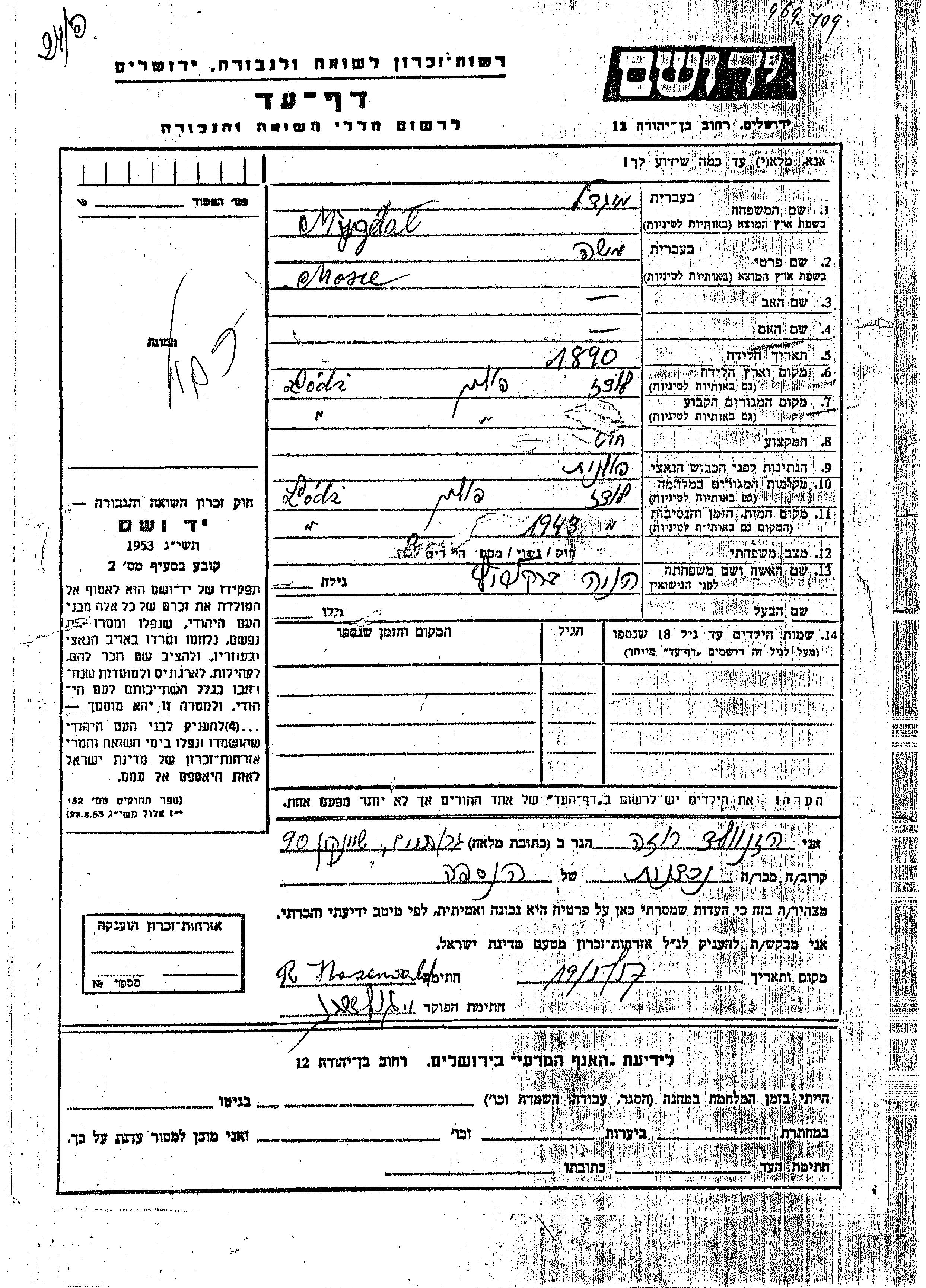Mose Mygdal est né à Lodz, Pologne en 1890. Il était Tailleur et Mariée à Henia née Berkovitz. Avant la seconde guerre mondiale il vivait à Lodz, Pologne. Au cours de la guerre, il était à Lodz, Pologne.