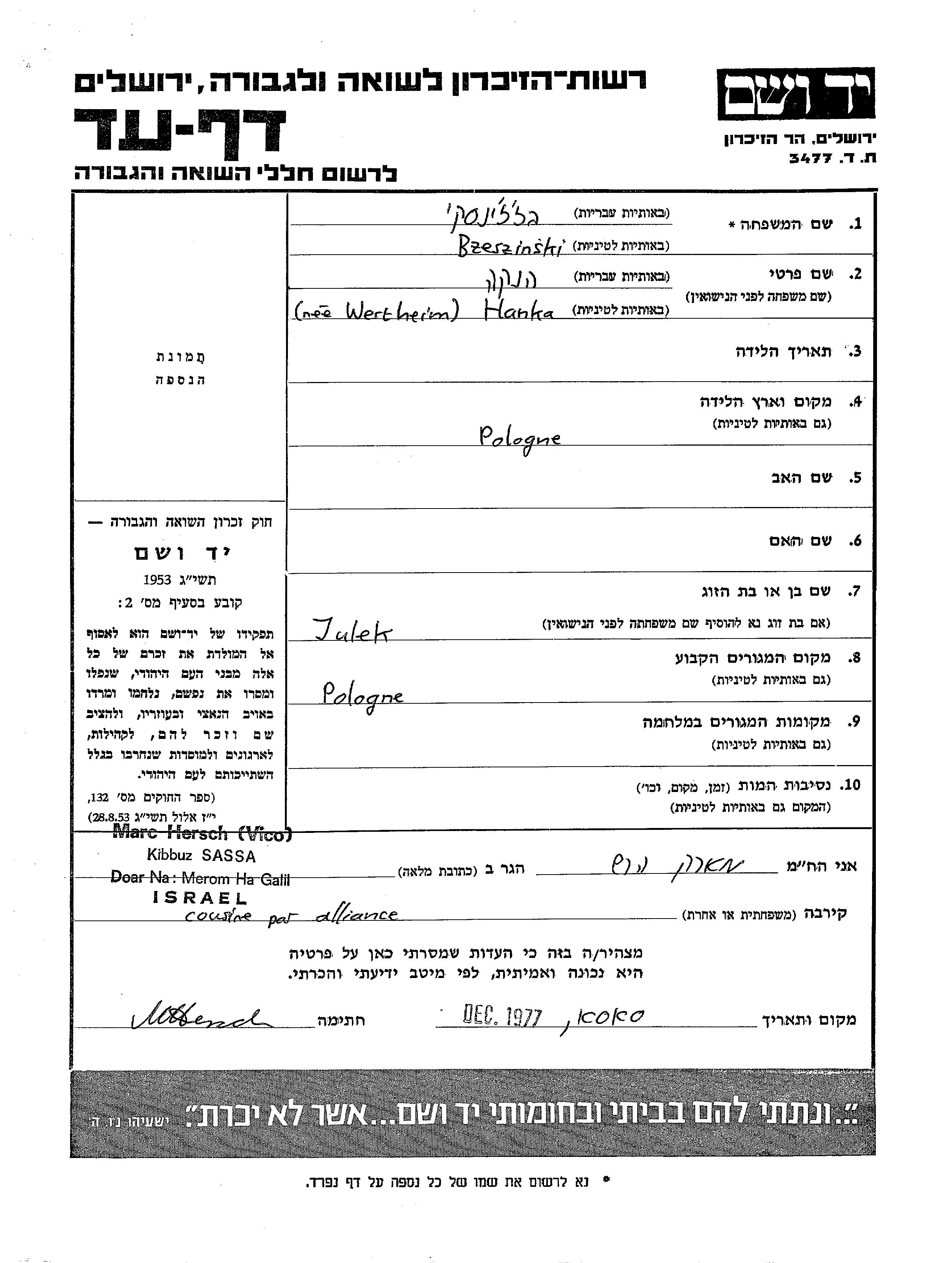 Bzeszinski Hanka Pologne Feuille de témoignage