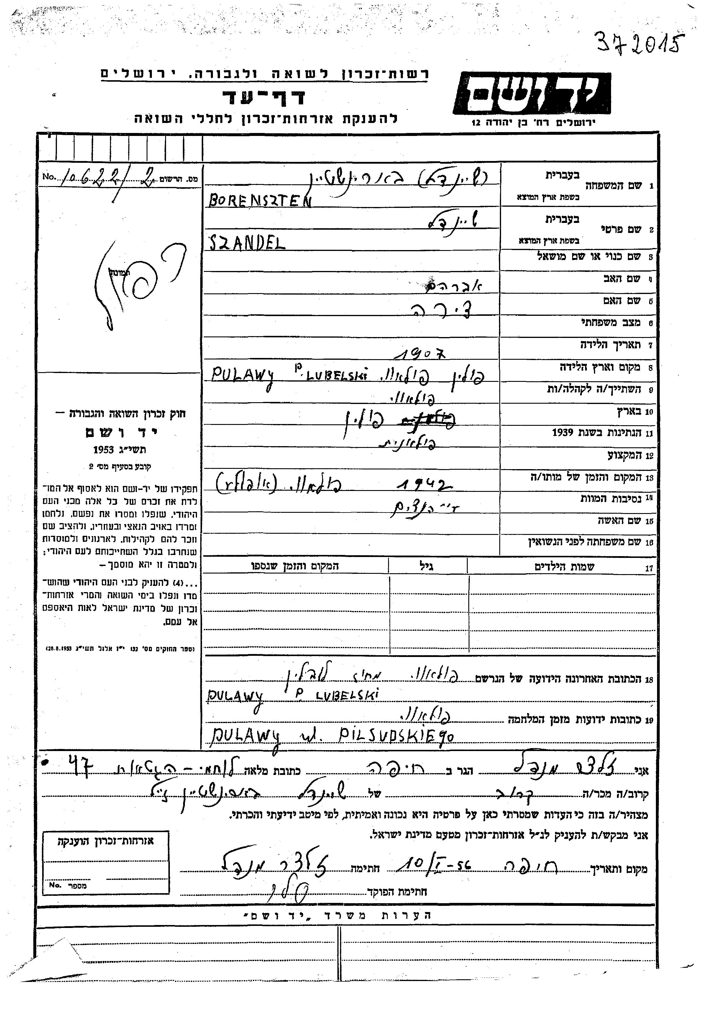 Borenszten Szandel 1907 Pulawy, Pologne Feuille de témoignage