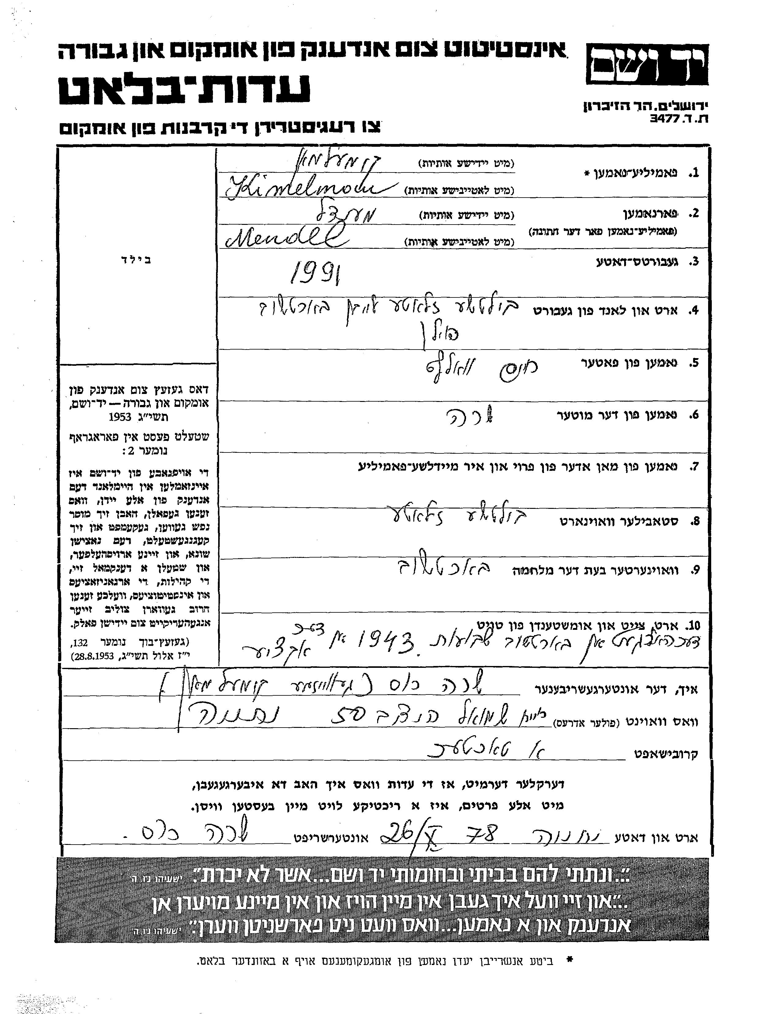 Mendel Kimelman est né à Bielcze Zlote, Pologne en 1891, fils de Khaim Volf et de Sara. Avant la seconde guerre mondiale il vivait à Bielcze Zlote, Pologne. Au cours de la guerre, il était à Borszczow, Pologne.