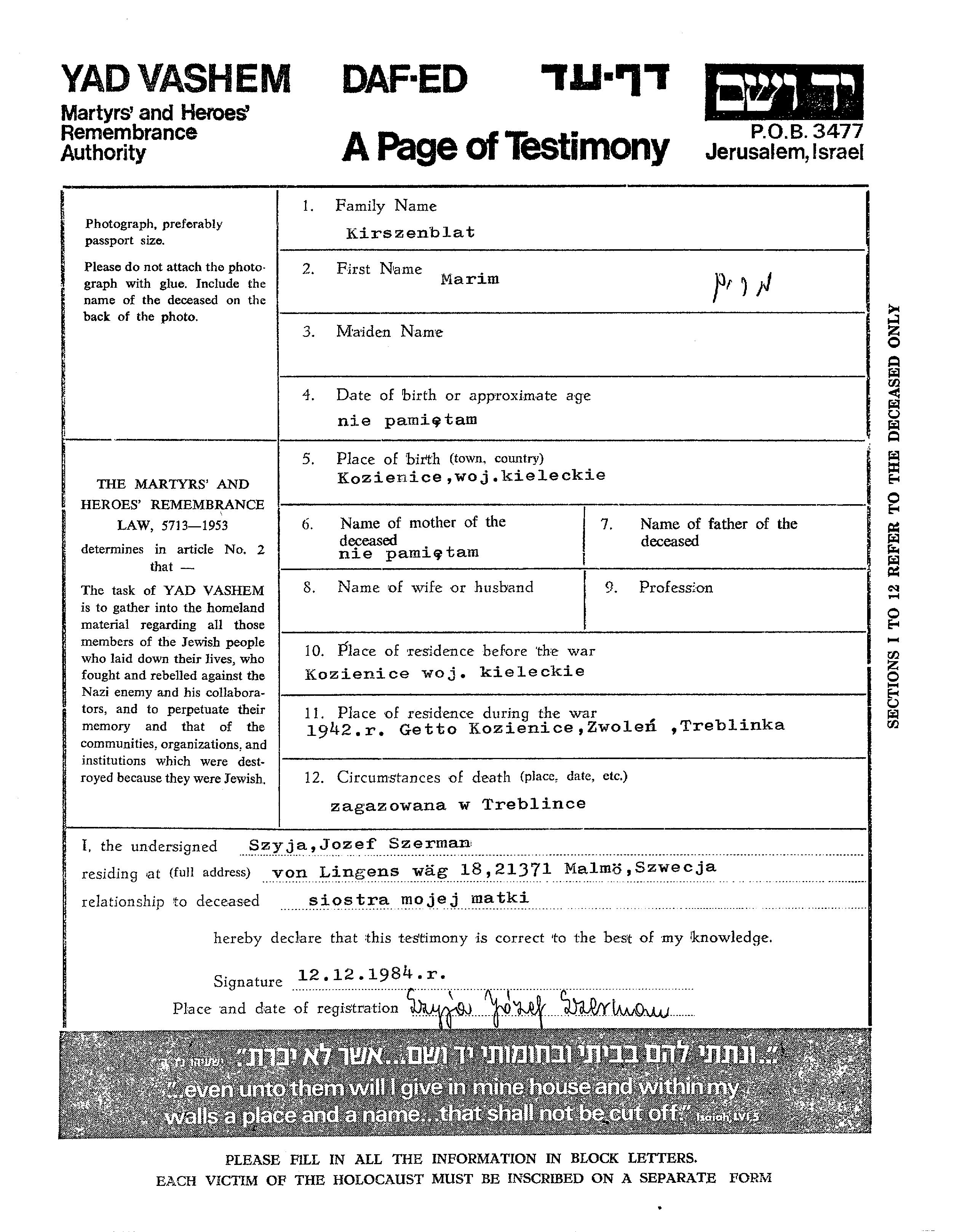Kirszenblat Marim Kozienice, Pologne Feuille de témoignage