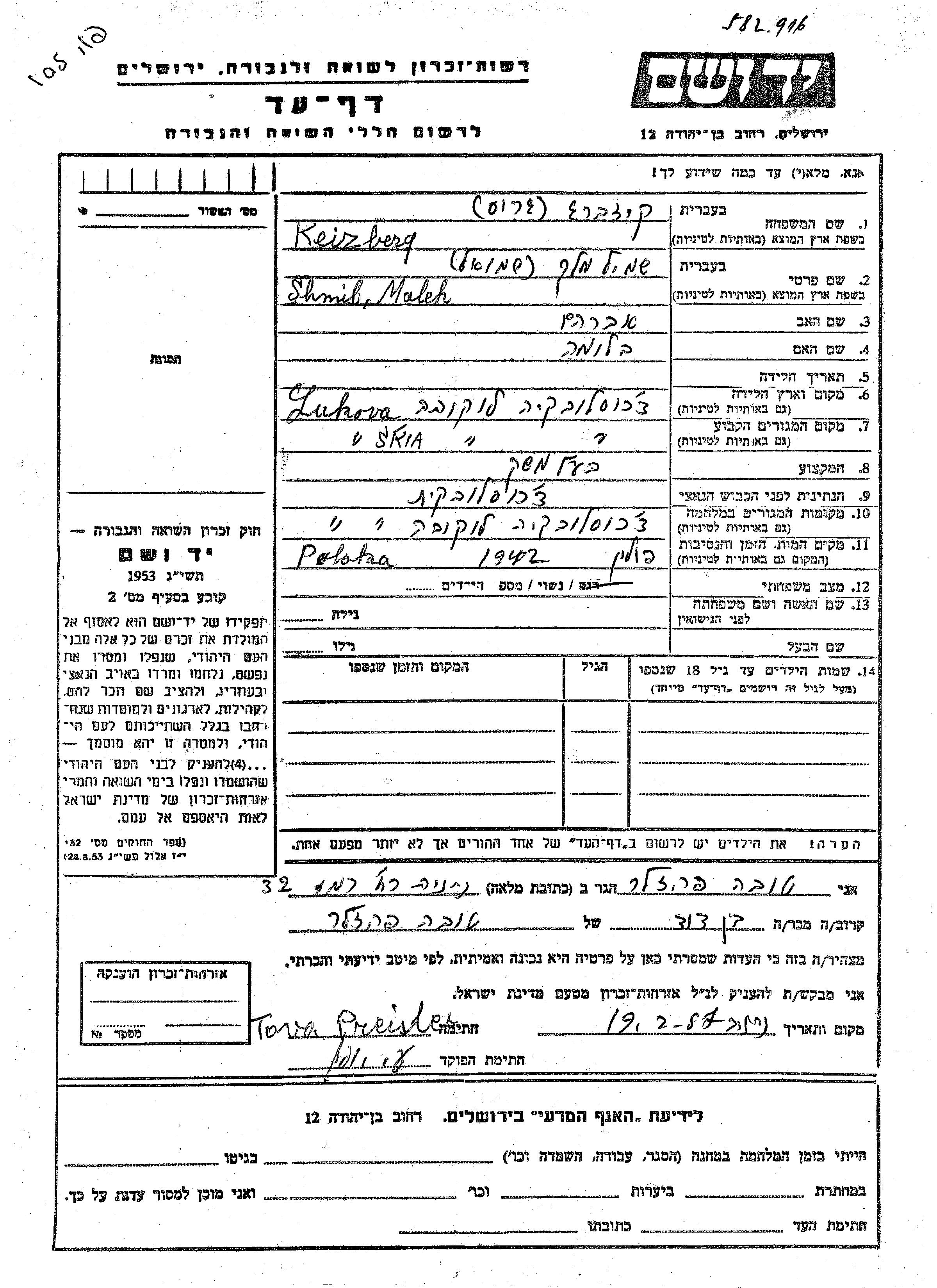 Keizberg Gros Shmil Maleh Lukova, Tchécoslovaquie Feuille de témoignage