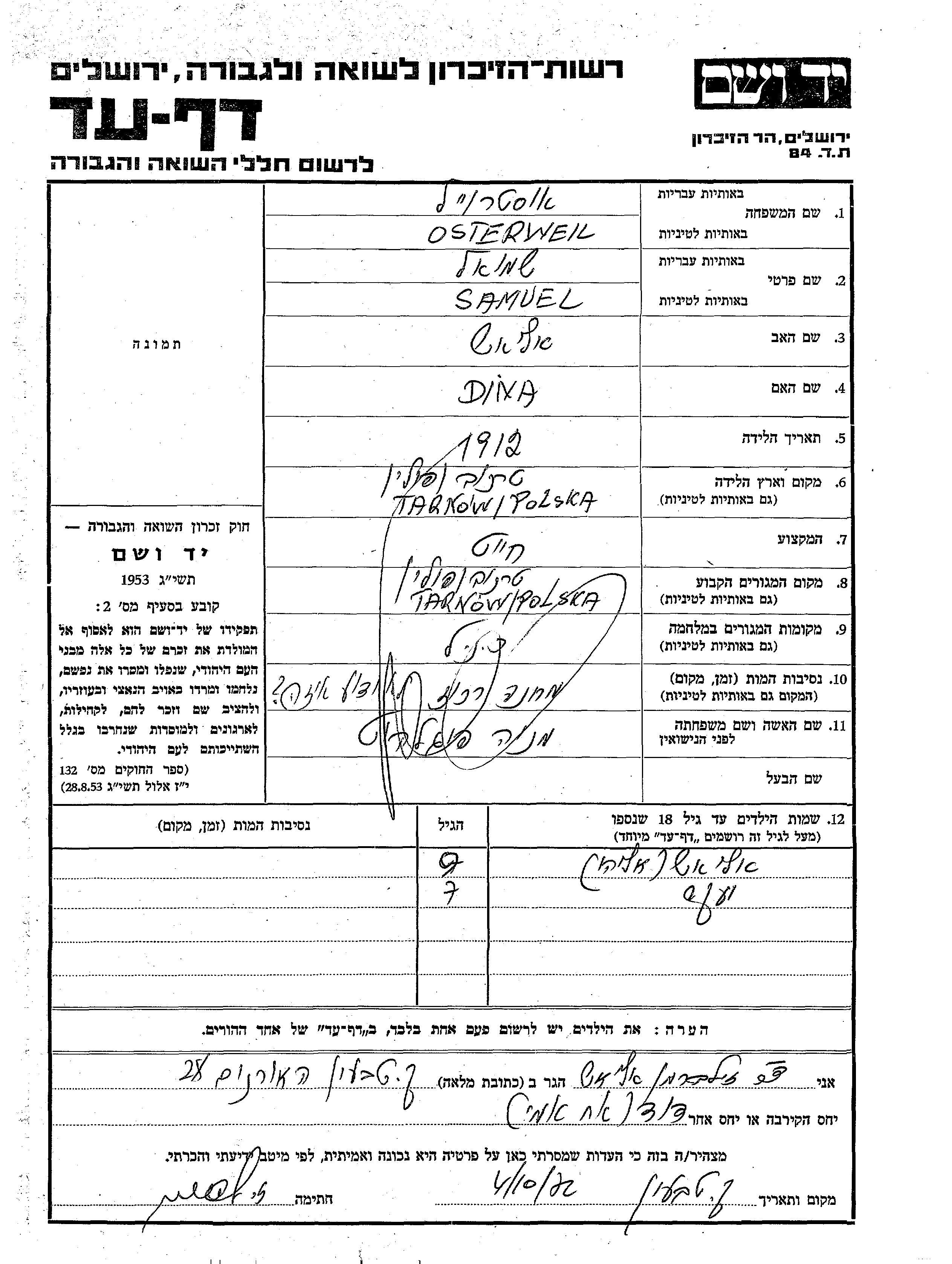 Osterweil Shmuel 1912 Tarnow, Pologne Feuille de témoignage