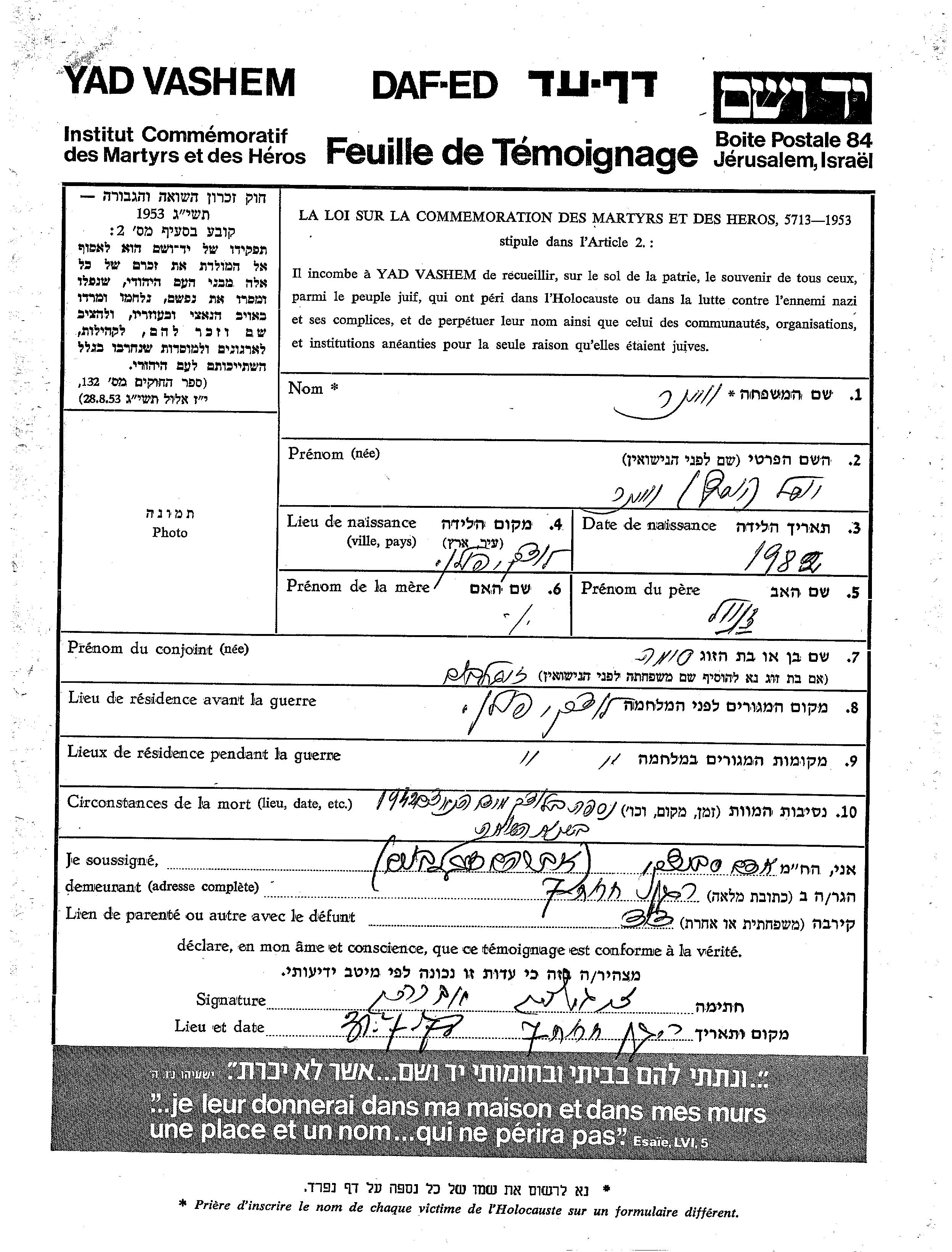Yad Vashem - Pages of Testimony Names Memorial Collection
