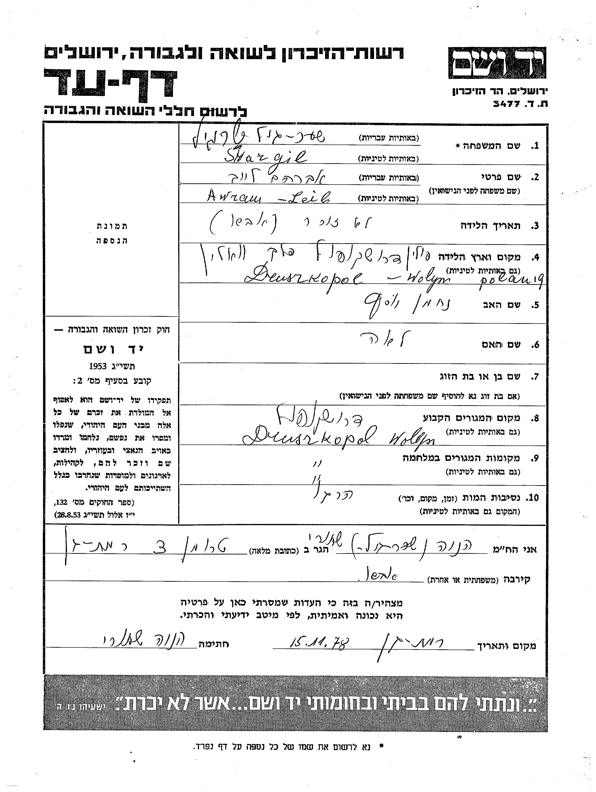 Shargil Awram Leib Druszkopol, Pologne Feuille de témoignage