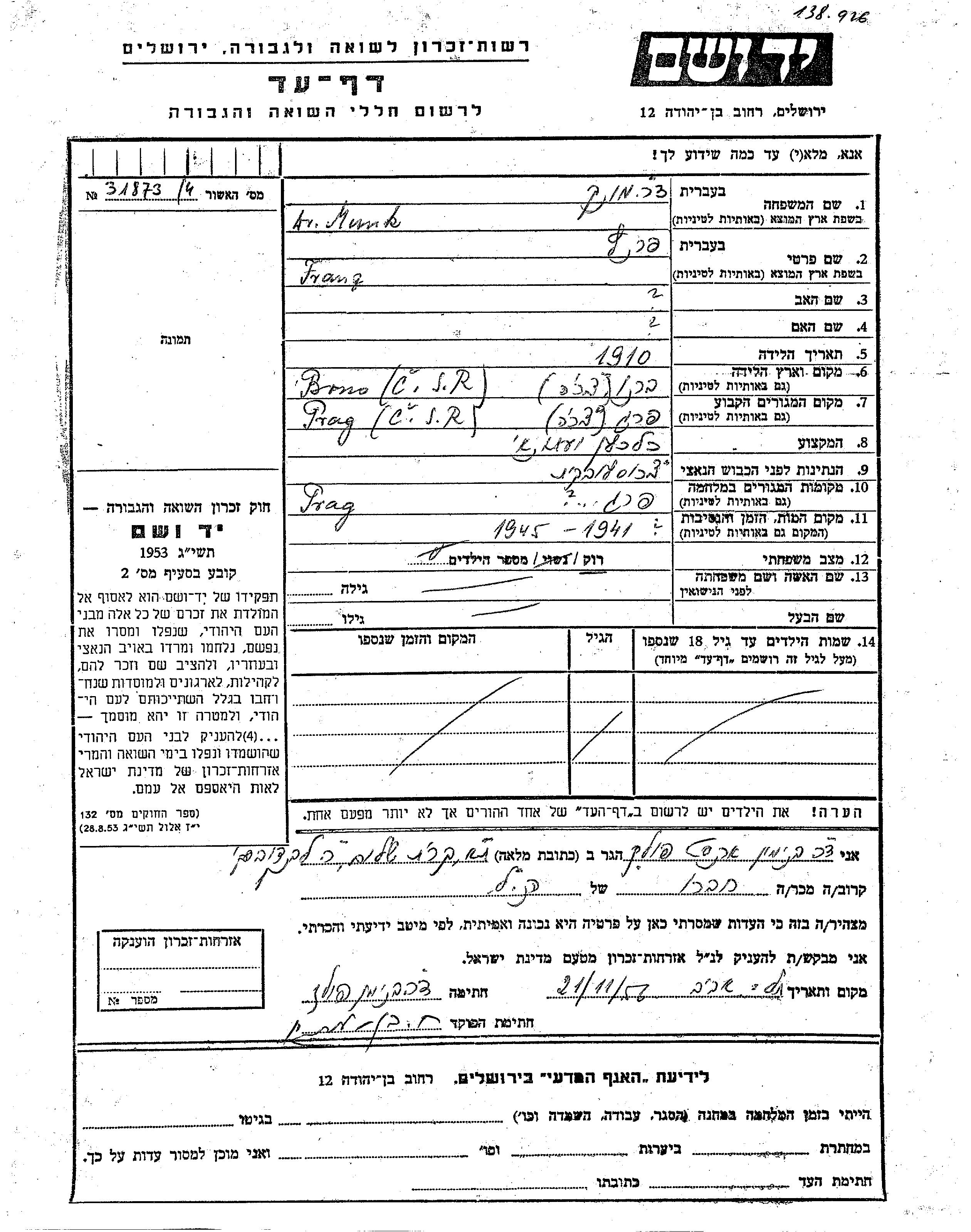 Munk Franz Ferentz 1910 Prague, Tchécoslovaquie Feuille de témoignage