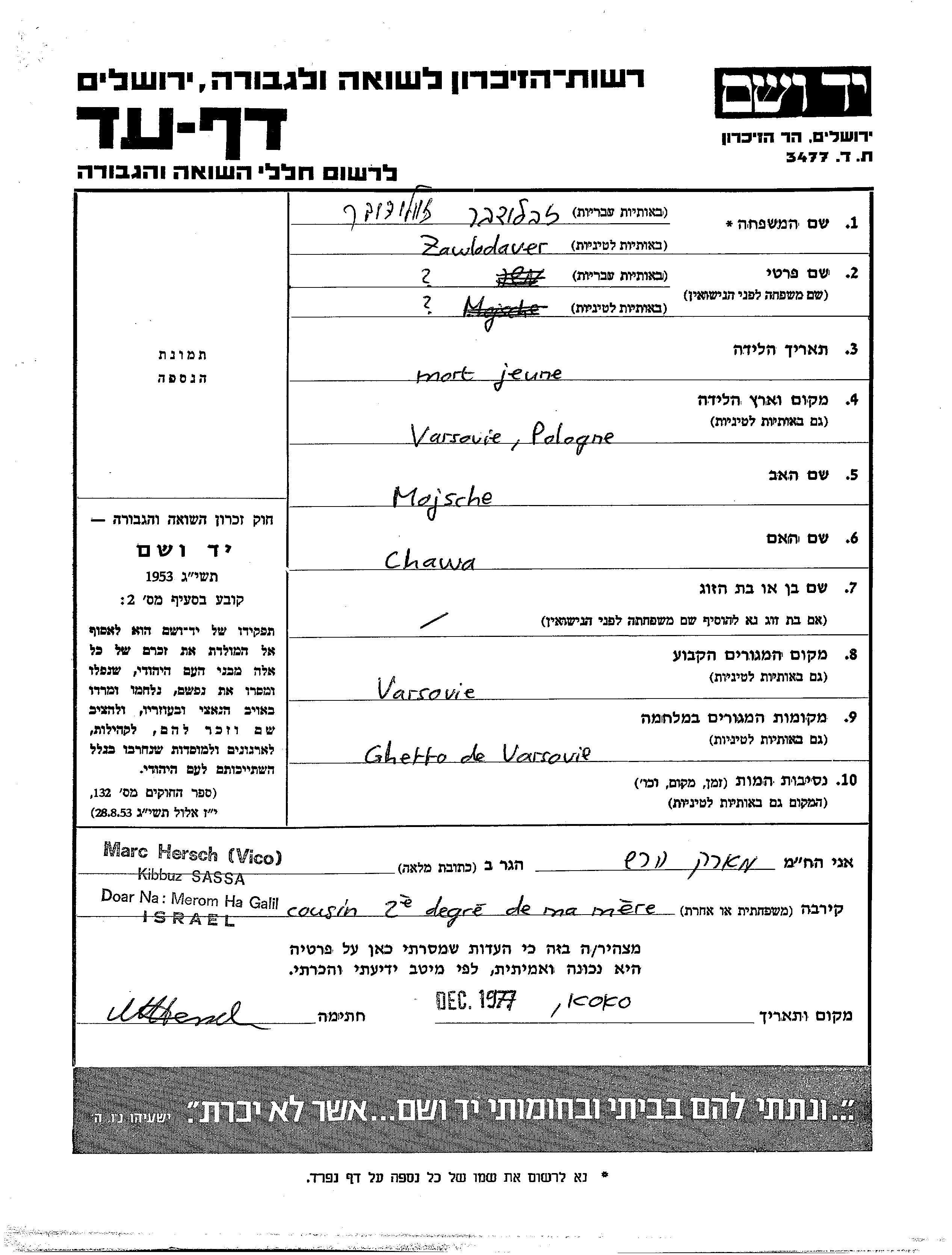 Zawlodaver prénom inconnu Warsaw, Pologne Feuille de témoignage