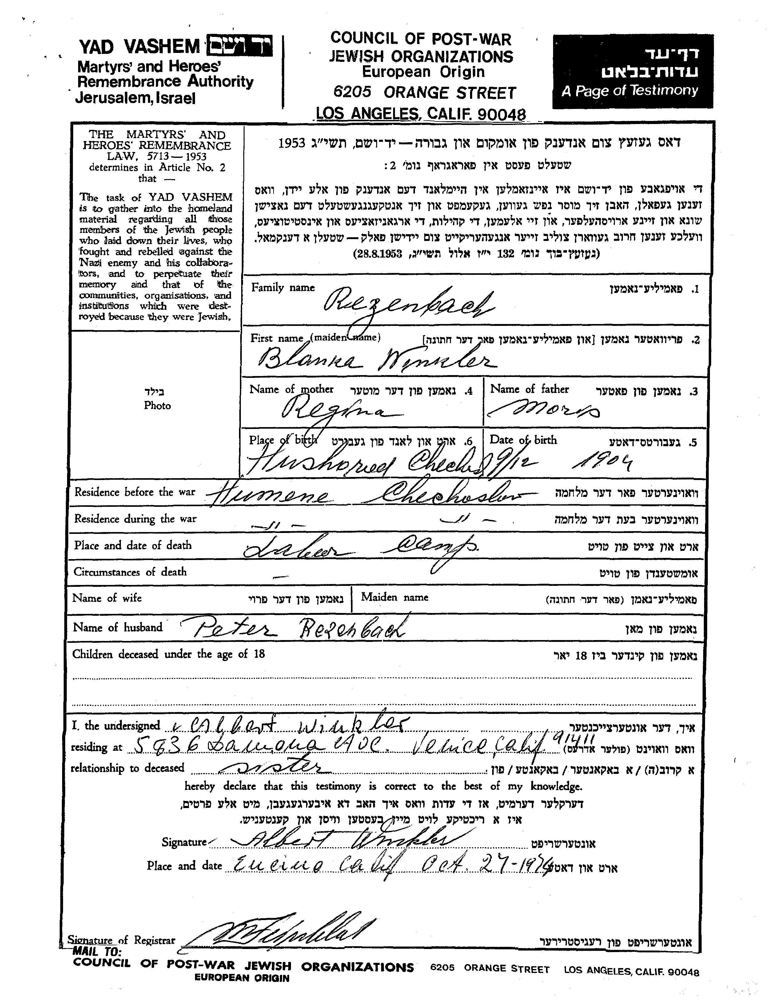 Blanka Rezenbach née Winkler est née à Hushorod, Tchécoslovaquie en 1904, fille de Moshe et de Regina. Avant la seconde guerre mondiale elle vivait à Humene, Tchécoslovaquie. Pendant la guerre, elle était à Humene, Tchécoslovaquie.