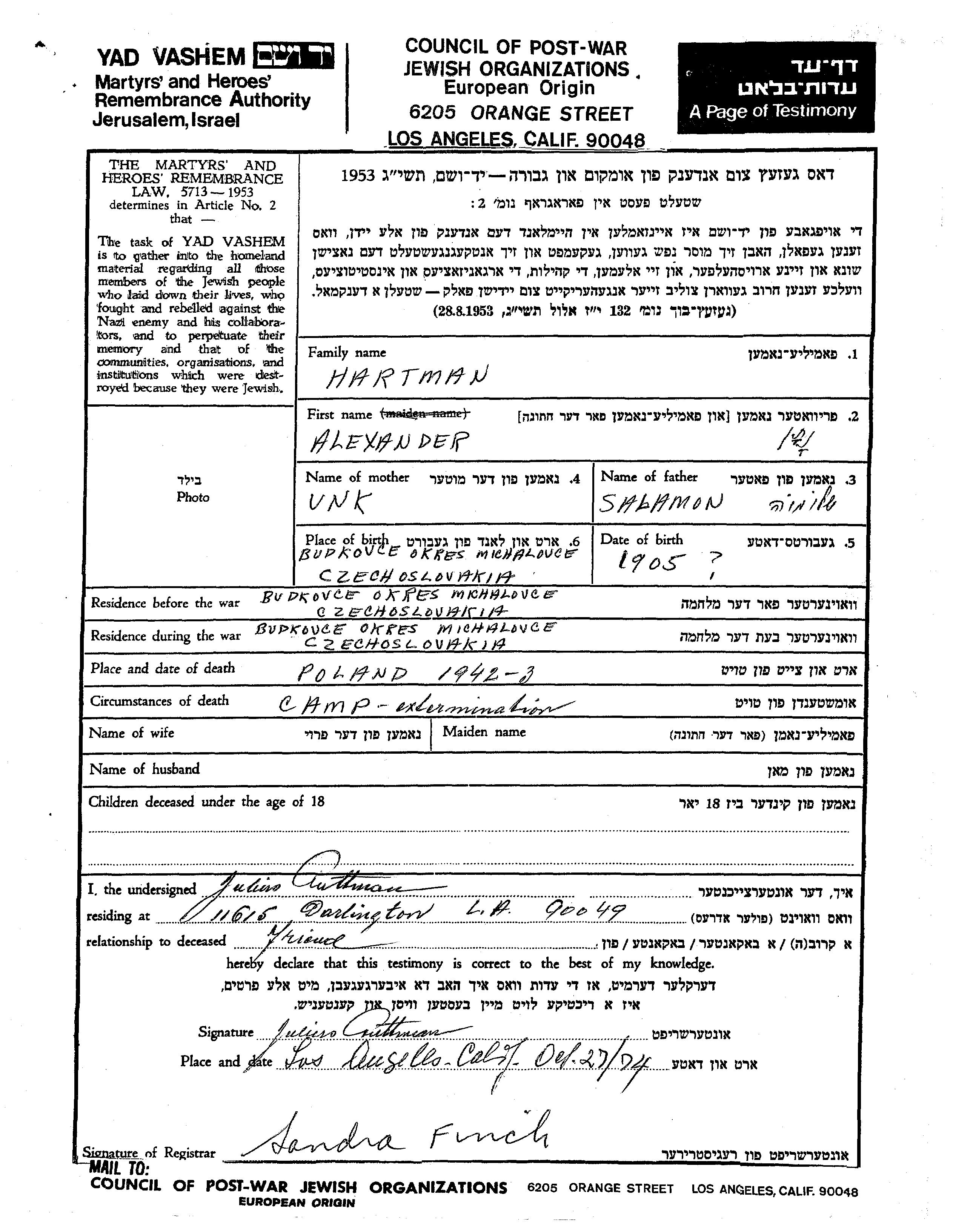 Hartman Alexander Natan 1905 Michalovce, Tchécoslovaquie Feuille de témoignage
