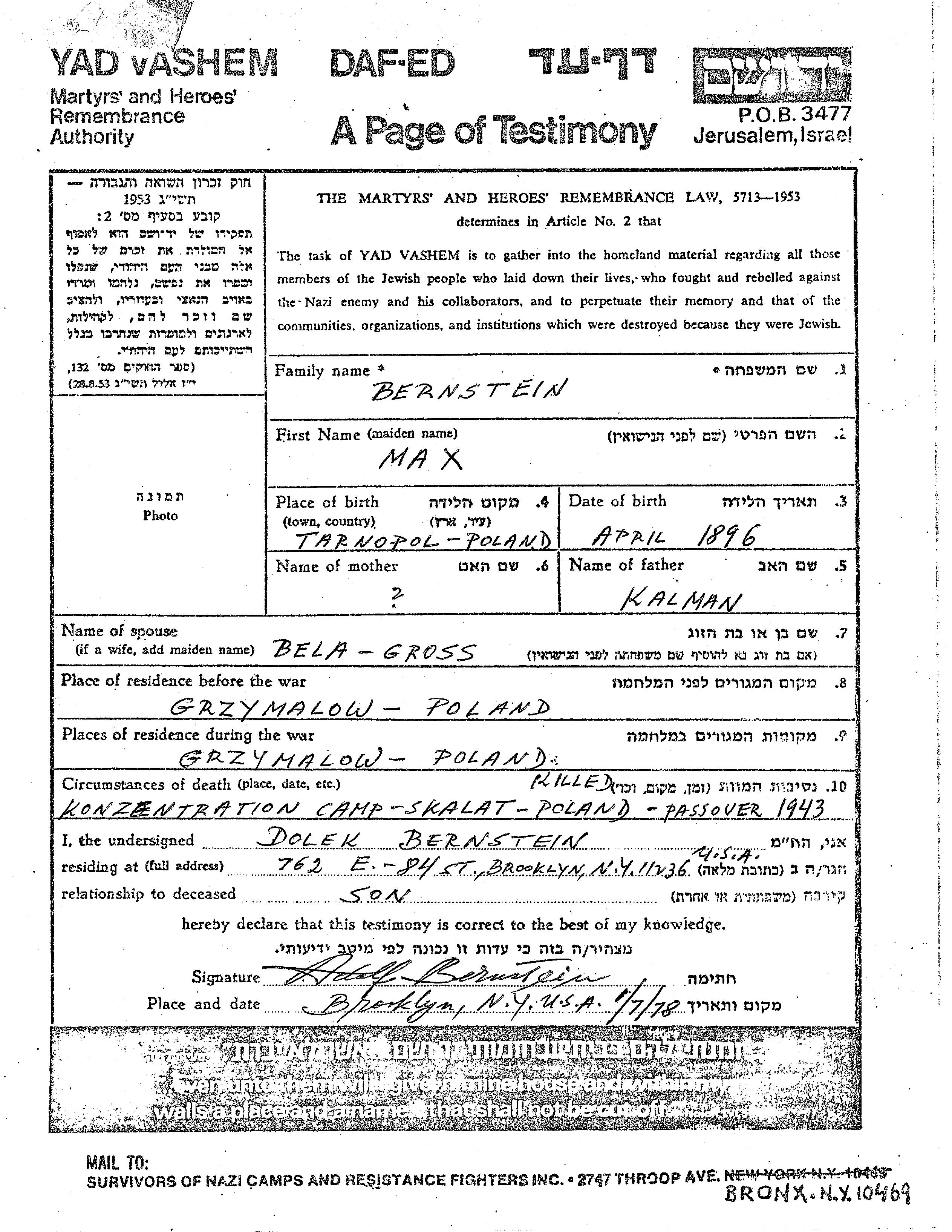 Max Bernstein est né à Tarnopol, Pologne en 1896, fils de Kalman. Il était Mariée à Bela née Gross. Avant la seconde guerre mondiale il vivait à Grzymałów, Pologne. Au cours de la guerre, il était à Grzymałów, Pologne.