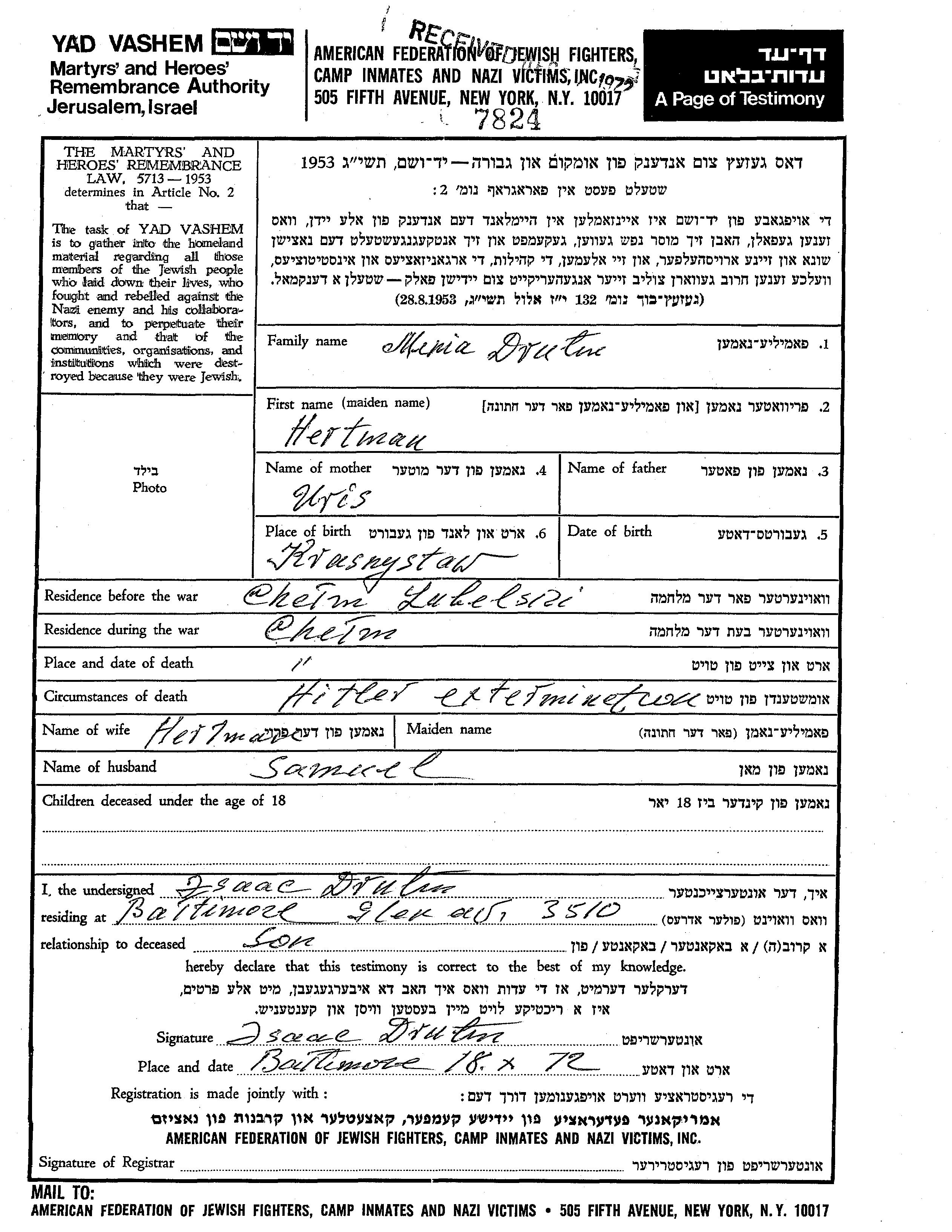 Drutin Menia Chelm, Pologne Feuille de témoignage