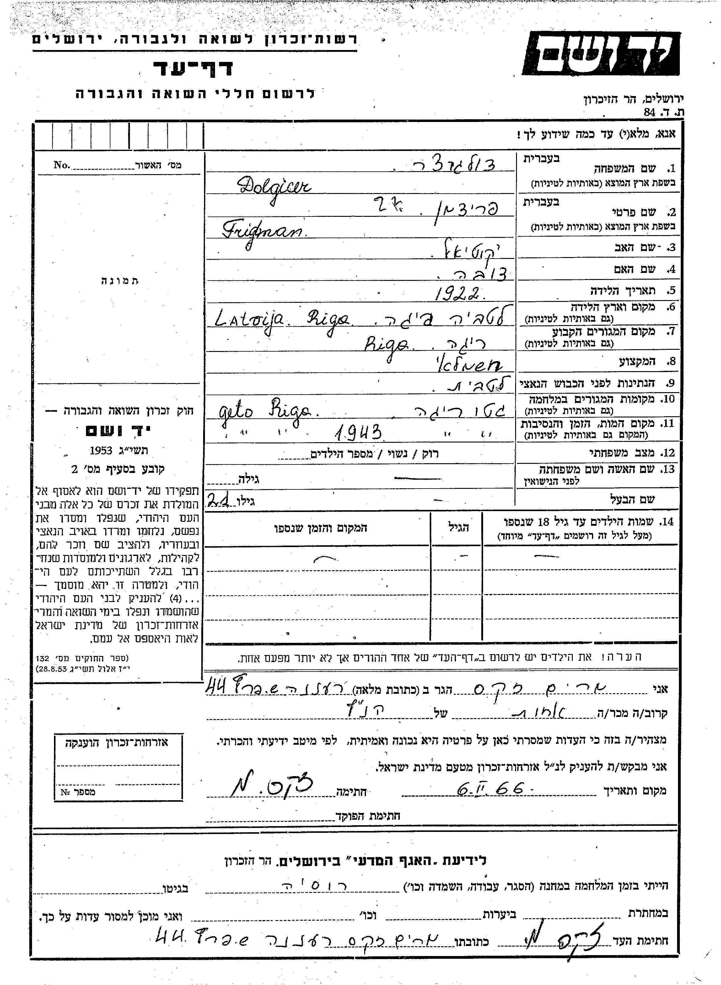 Fridman a été assassiné pendant la Shoah. Lieu de la mort: Riga, Lettonie en 1943.