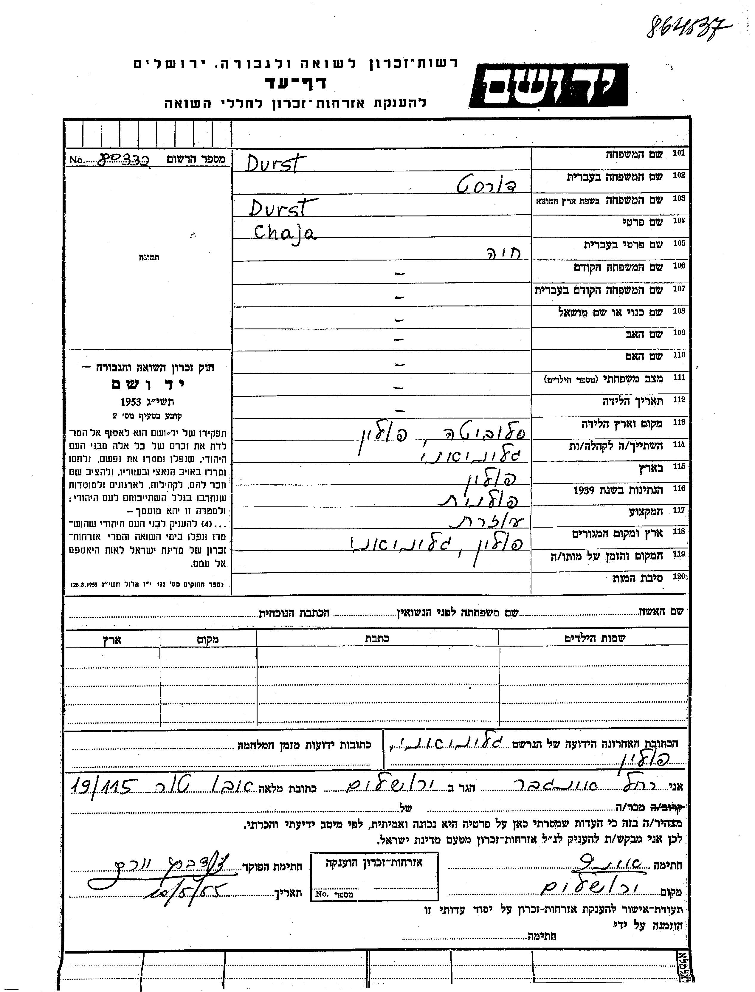 Chaja Durst est née à Slowita, Pologne. Elle était Helper. Avant la seconde guerre mondiale elle vivait à Gliniany, Pologne. Pendant la guerre, elle était à Gliniany, Pologne.
