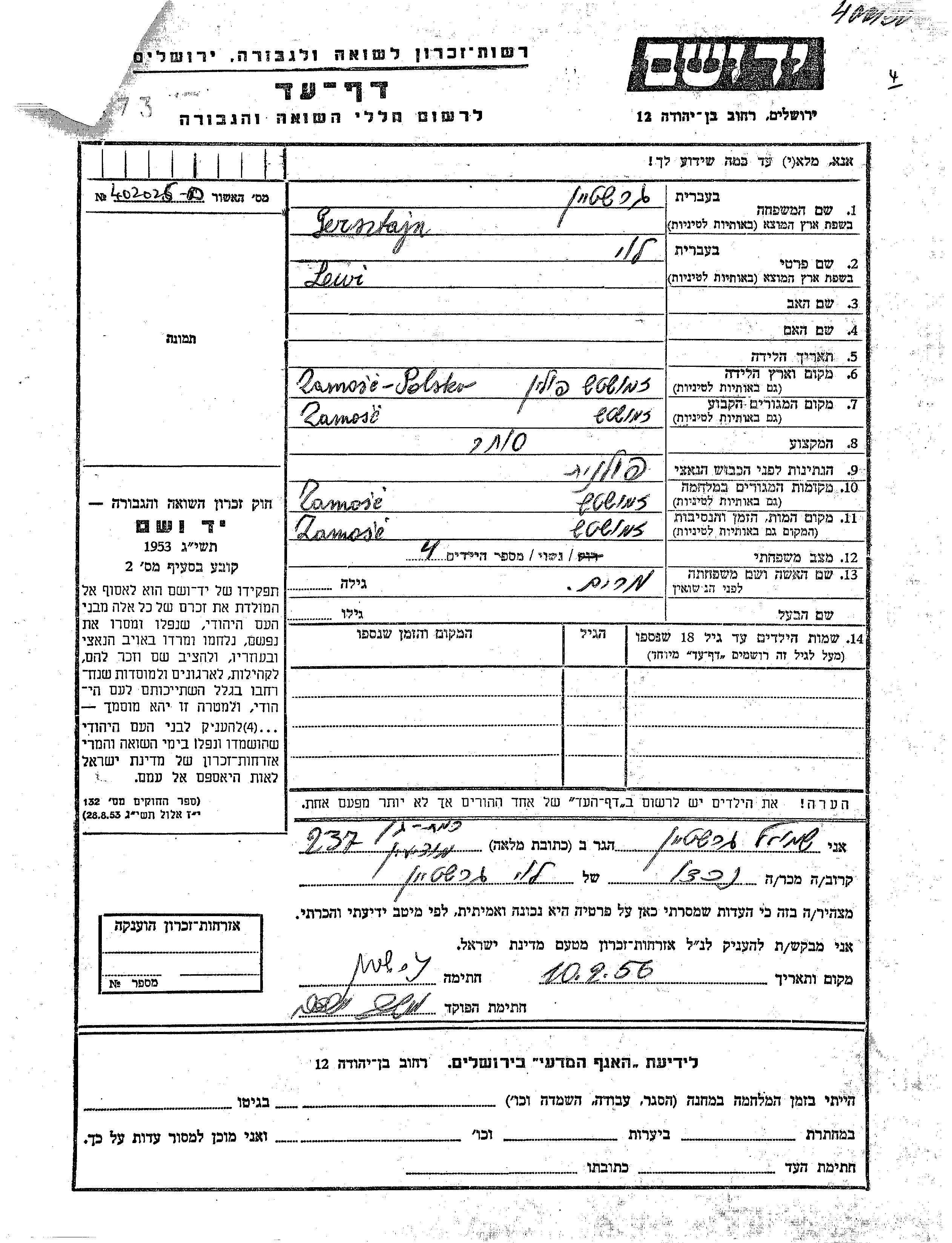 Gersztajn Lewi Zamosc, Pologne Feuille de témoignage