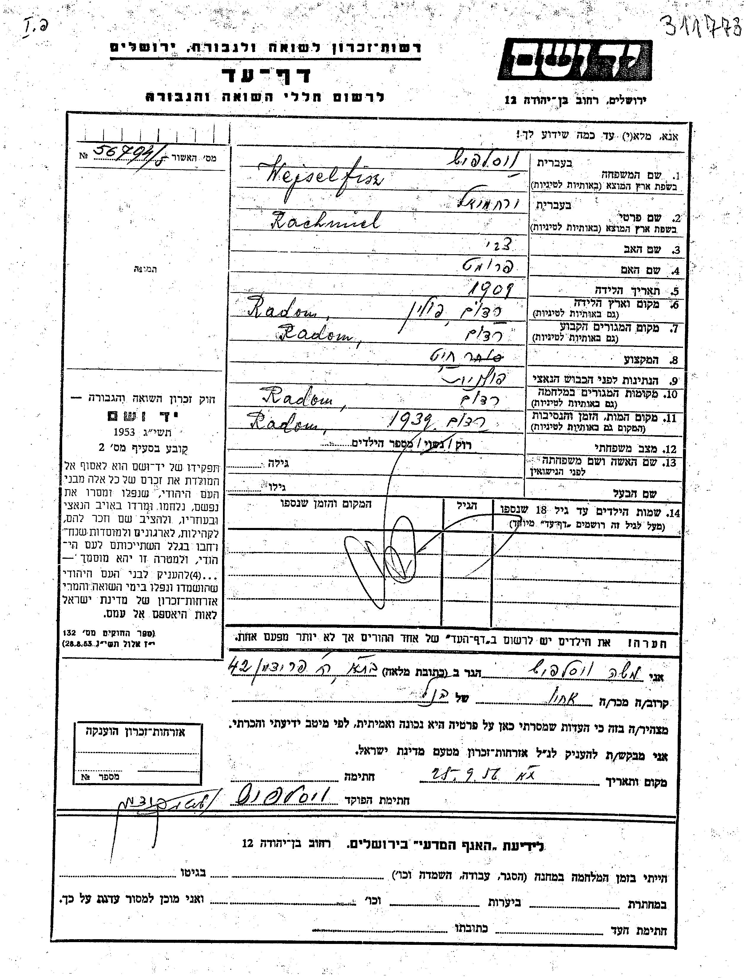 Wejselfisz Rachmiel 1909 Radom, Pologne Feuille de témoignage
