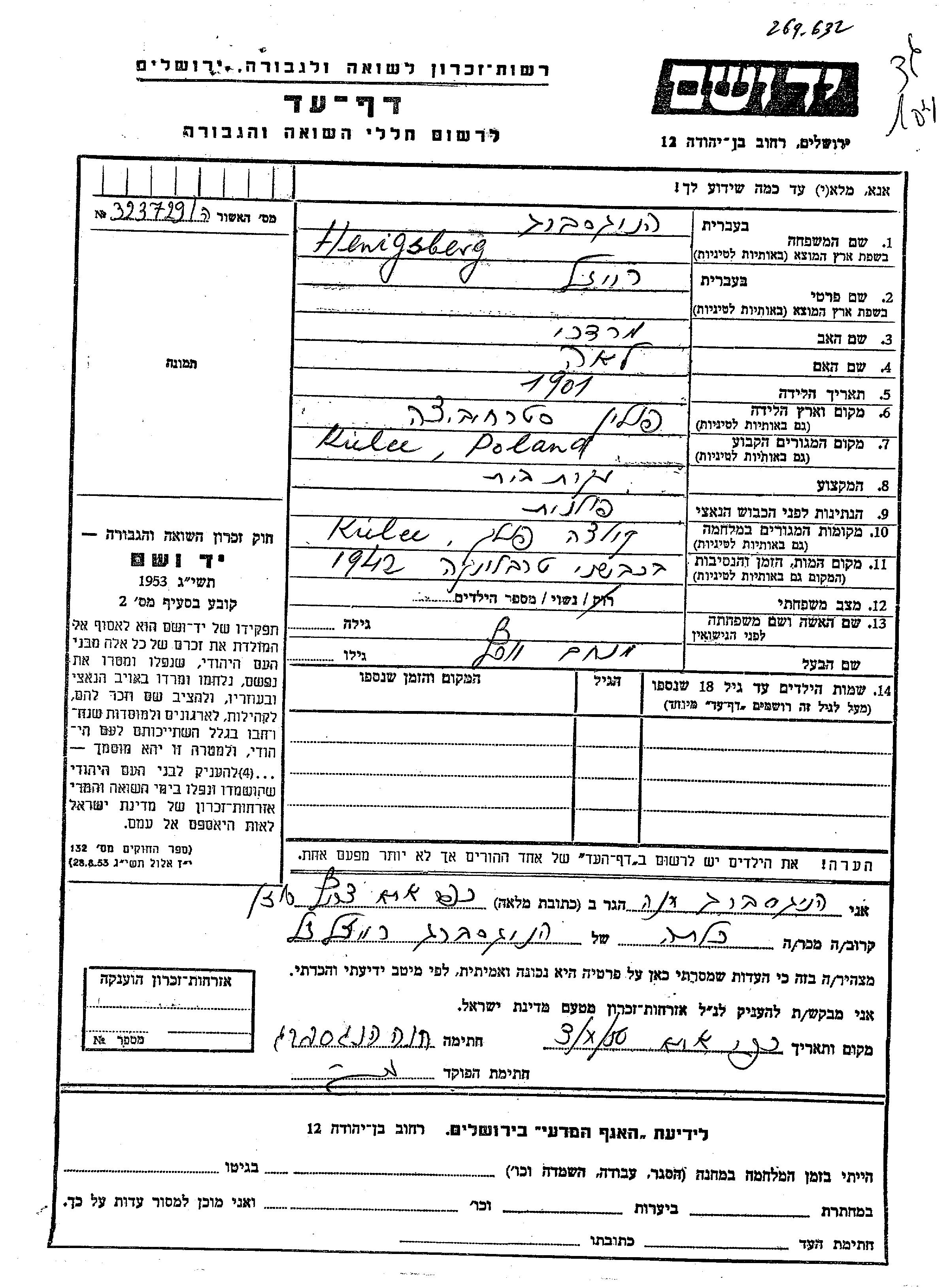 Roza Henigsberg est née à Strachowice, Pologne en 1901, fille de Mordekhai et de Lea. Elle était Femme au foyer et Mariée à Menakhem Yosef. Avant la seconde guerre mondiale elle vivait à Kielce, Pologne. Pendant la guerre, elle était à Kielce, Pologne.