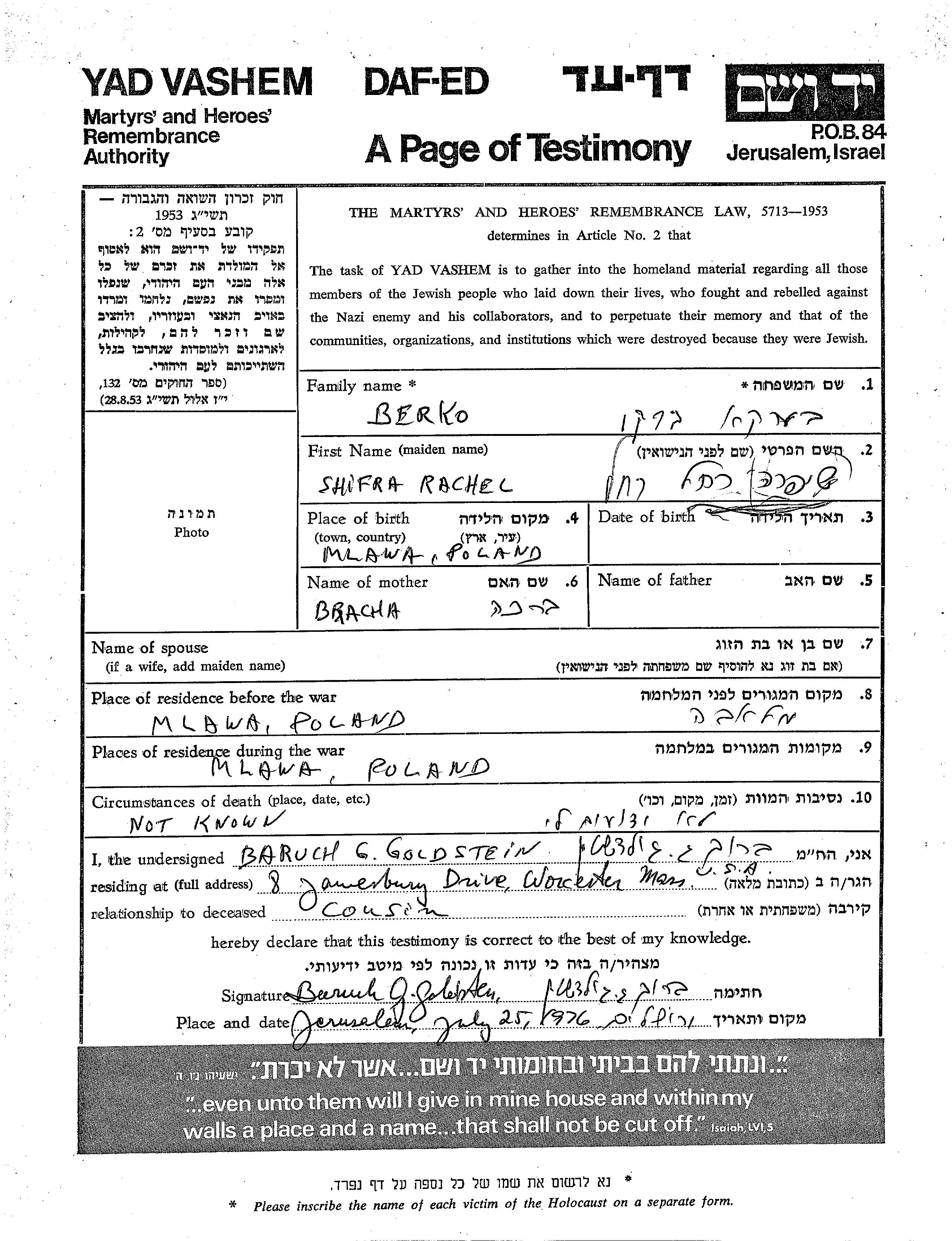 Berko Rachel Shifra Mlawa, Pologne Feuille de témoignage
