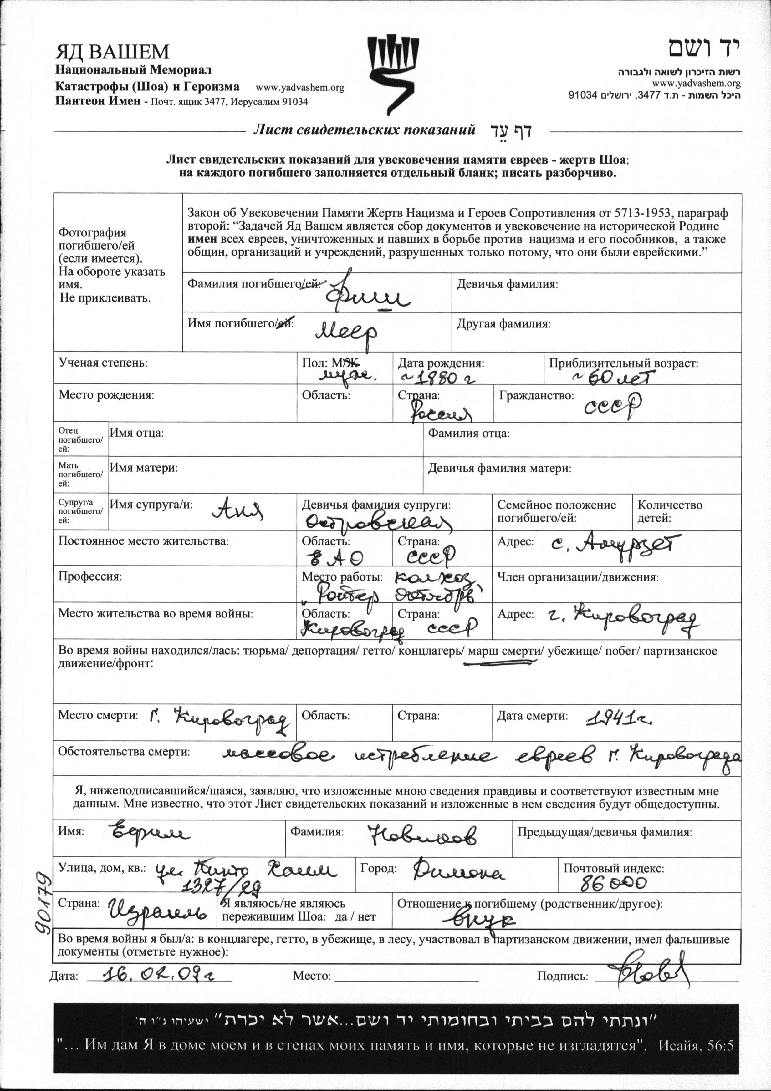 Meyer Fish est né à Russie (URSS) en 1880. Il était Mariée à Anya née Ostrovskaya. Avant la seconde guerre mondiale il vivait à Amurzet, Russie (URSS). Au cours de la guerre, il était à Kirovograd, Ukraine (URSS).