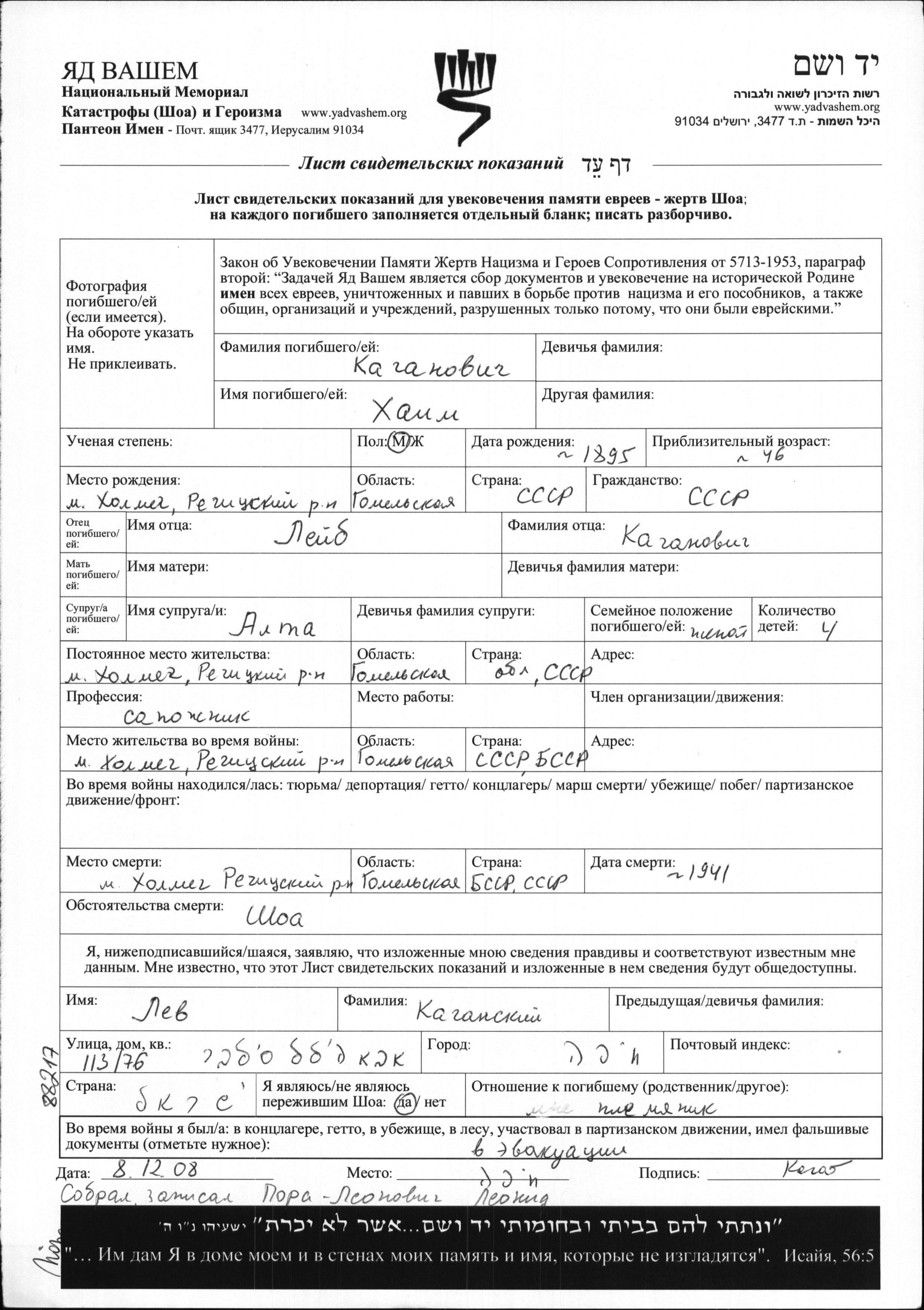Kaganovich Khaim 1895 Kholmech, Bélorussie (URSS) Feuille de témoignage