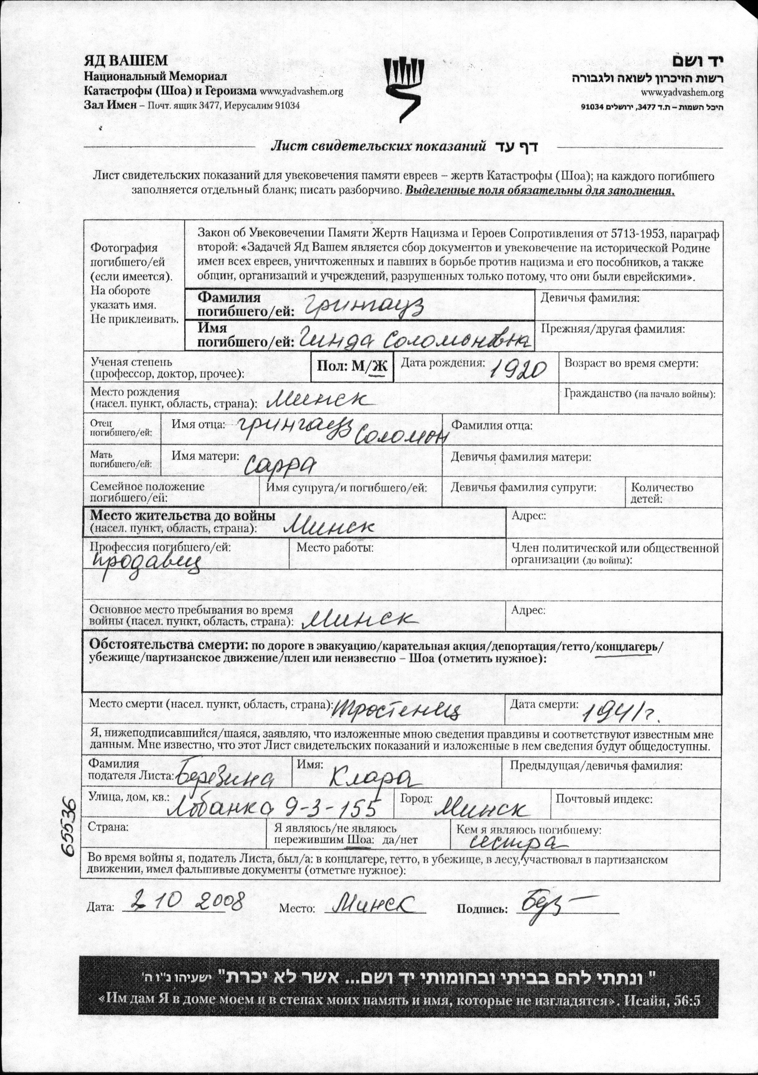 Gringauz Ginda 1920 Minsk, Bélorussie (URSS) Feuille de témoignage