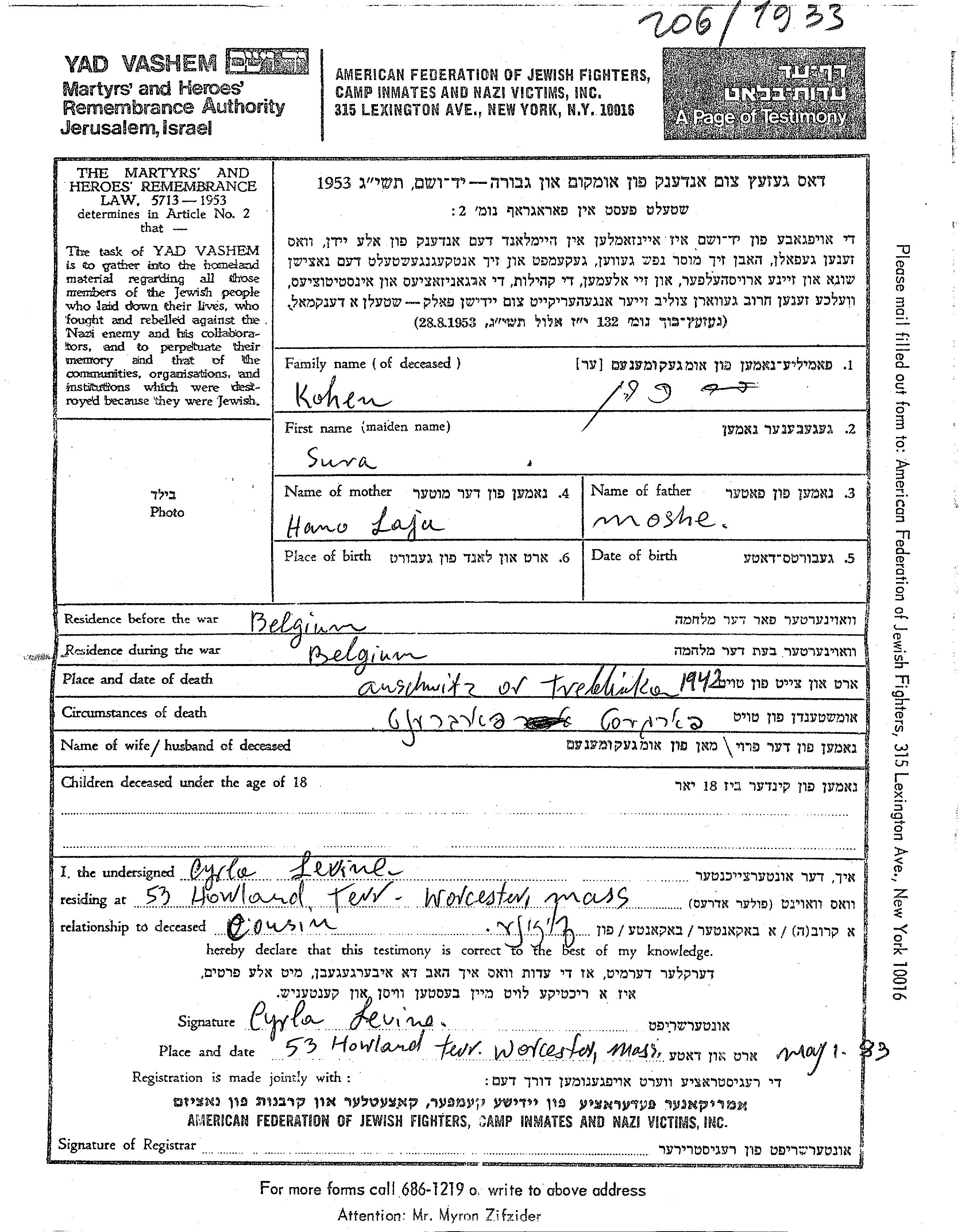 Kohen Sura Belgique Feuille de témoignage