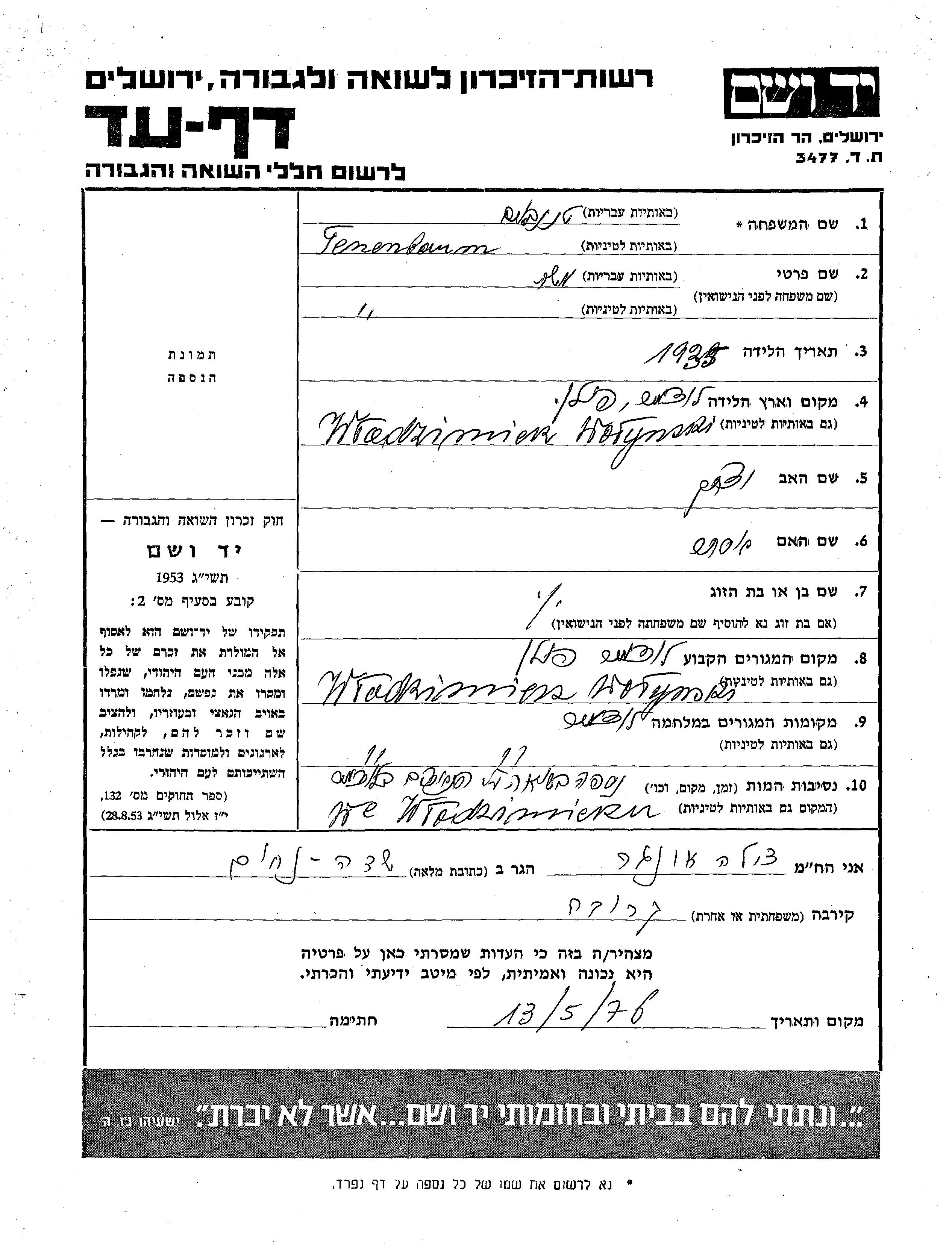 Tenenbaum Moshe 1935 Wladimir Wolynski, Pologne Feuille de témoignage