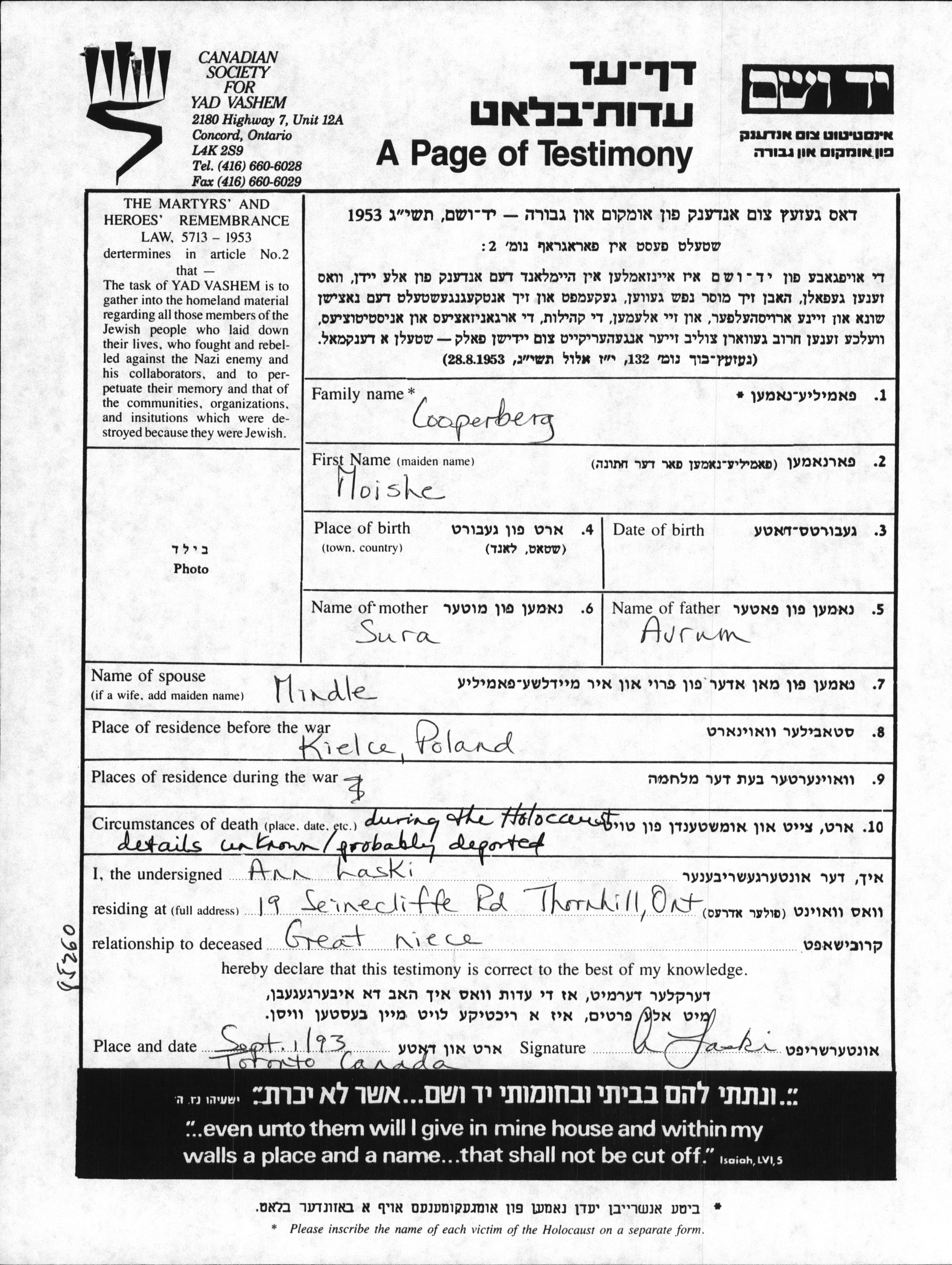 Moishe Cooperberg est né fils de Avrum et de Sura. Il était Mariée à Mindle. Avant la seconde guerre mondiale il vivait à Kielce, Pologne. Au cours de la guerre, il était à Kielce, Pologne.