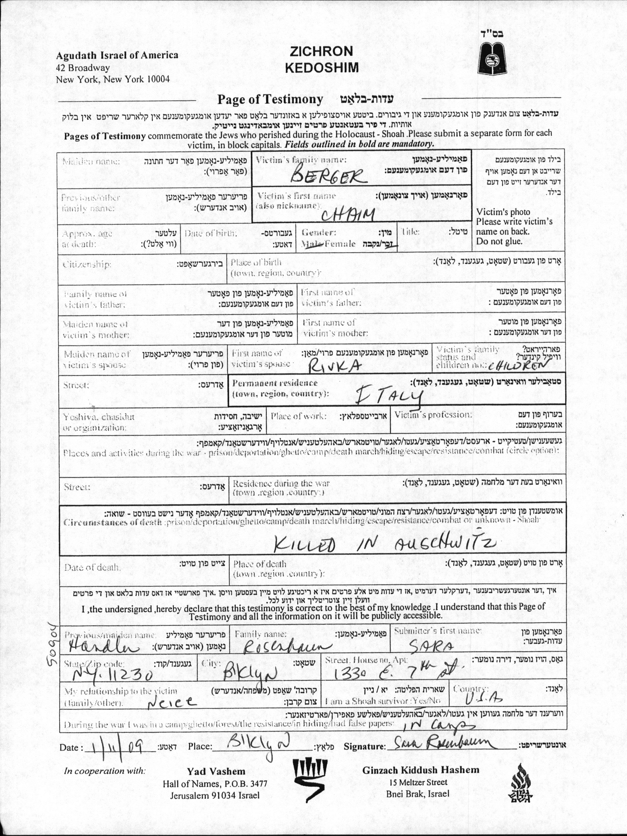 Chaim Berger. Il était Mariée à Rivka. Avant la seconde guerre mondiale il vivait à Italie.