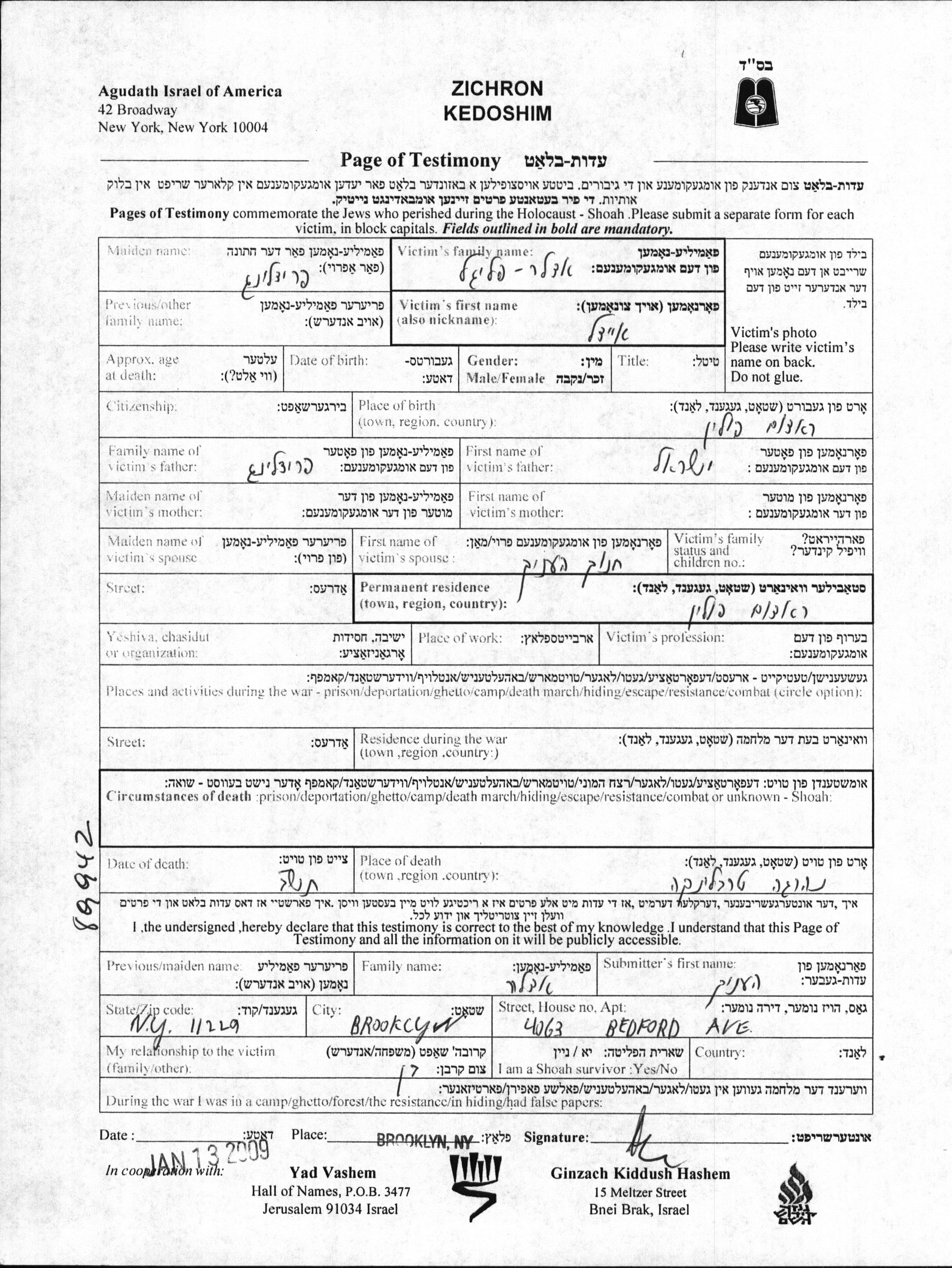 Yad Vashem - Pages of Testimony Names Memorial Collection