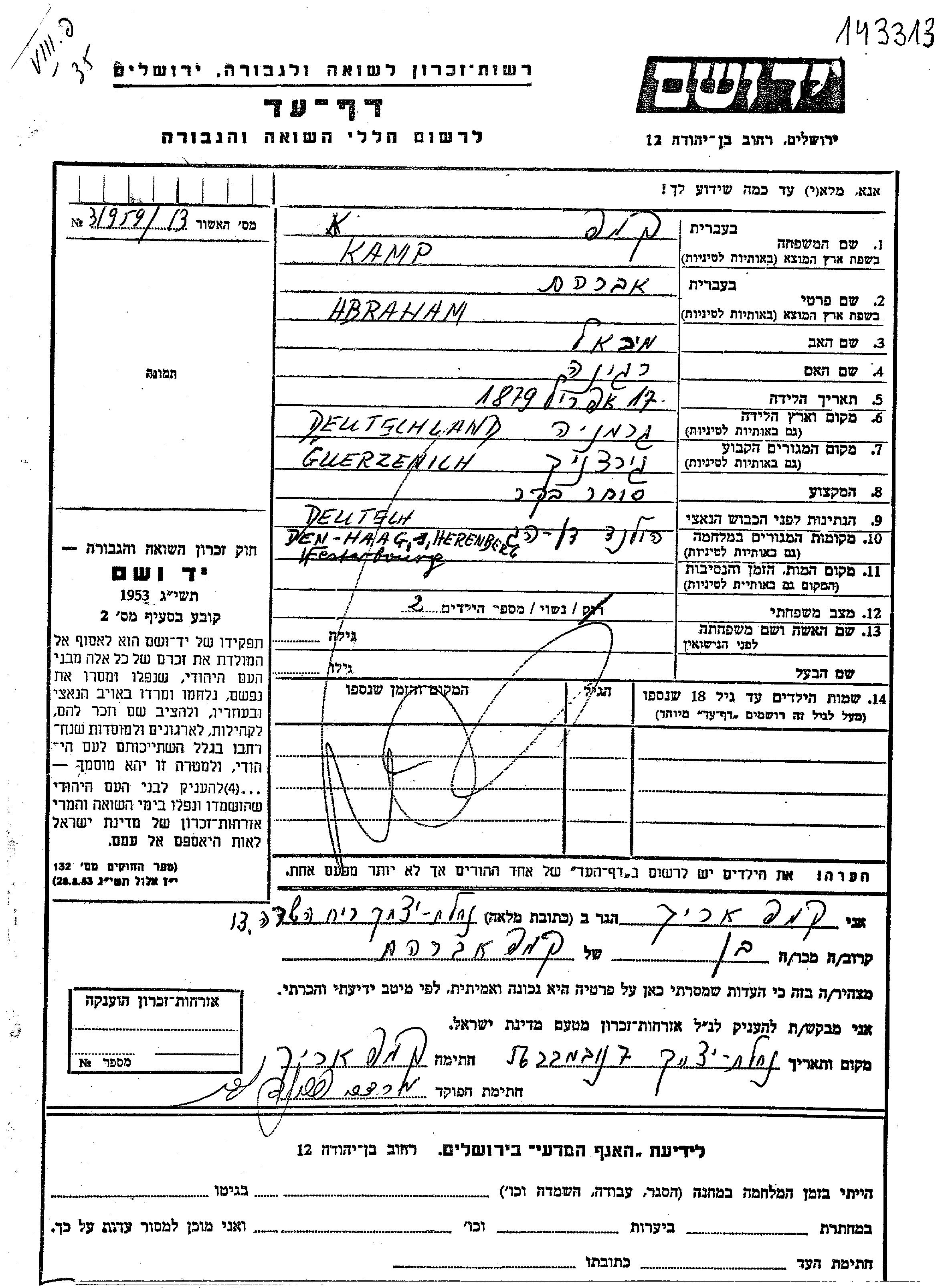 Abraham Kamp est né à Allemagne en 1879, fils de Mikhael et de Regina. Il était Négociant en bétail et Marié. Avant la seconde guerre mondiale il vivait à Guerzenich, Allemagne. Au cours de la guerre, il était à Haag, Allemagne.
