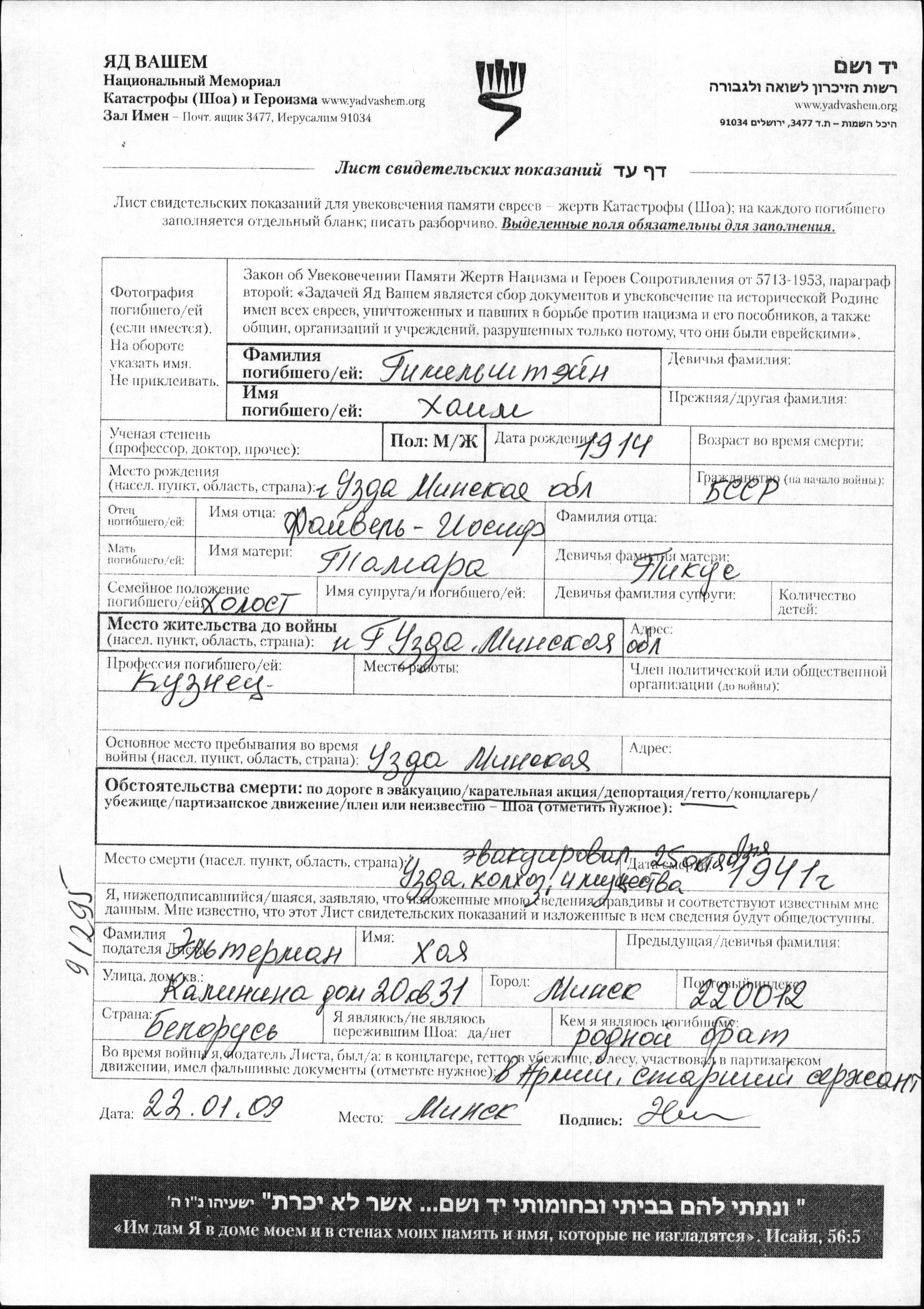 Gimelshtein Khaim 1914 Uzda, Bélorussie (URSS) Feuille de témoignage